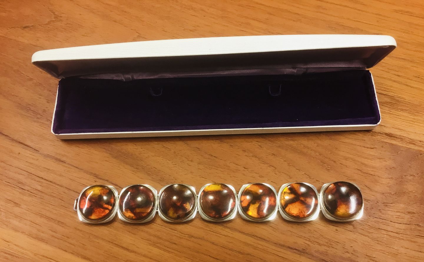 Bent Knudsen Armlænke af Sterling sølv med rav. Stemplet Bent Knudsen Sterling Denmark 35. L 18,5 cm, B 2,5 cm, med minimale brugsspor.