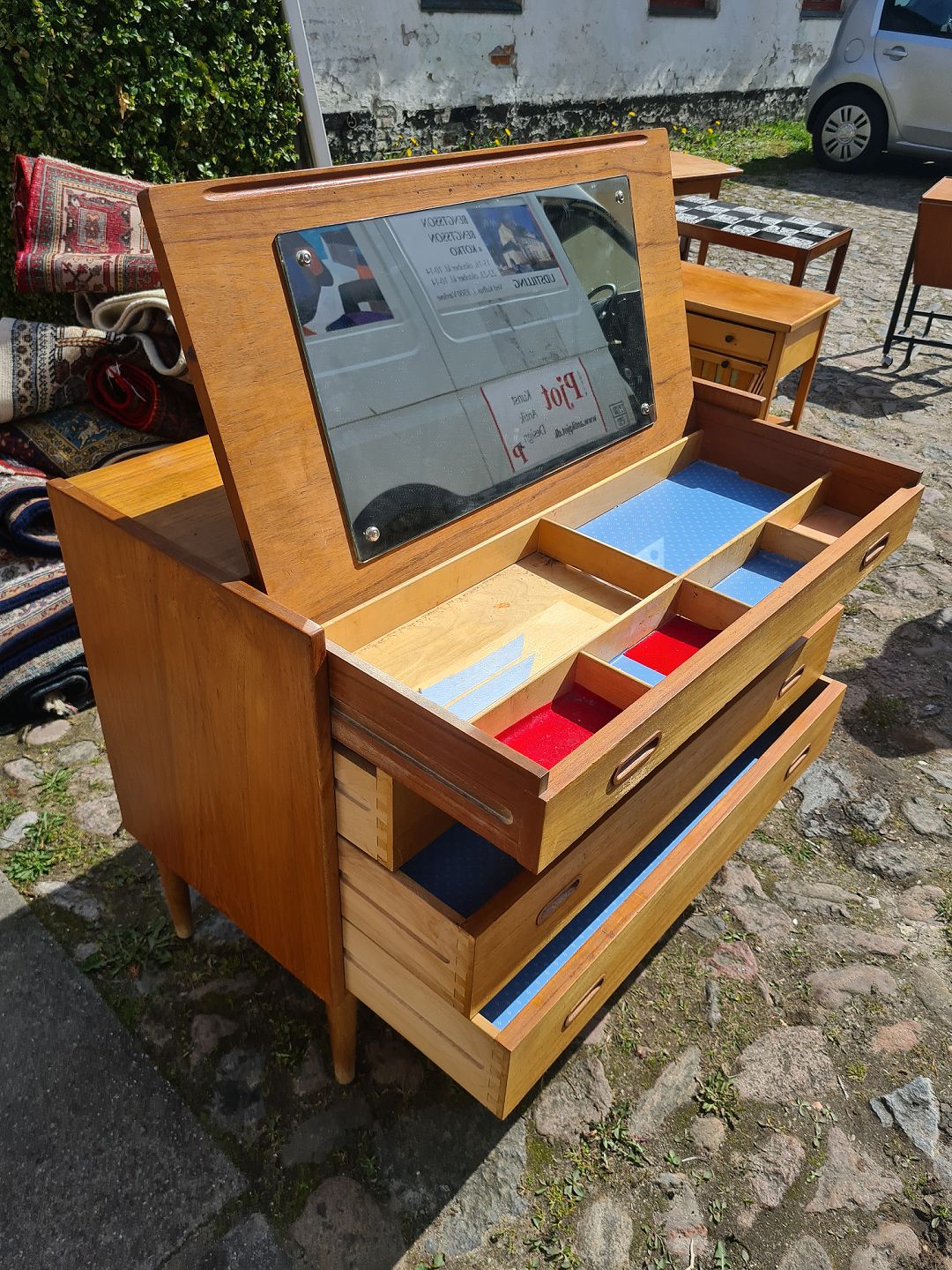 Kommode i teaktræ fra 1960´erne med sminkebord og spejl. Fremstår pæn og funktionel dog med lidt brugsspor omkring de øverste skuffehåndtag.