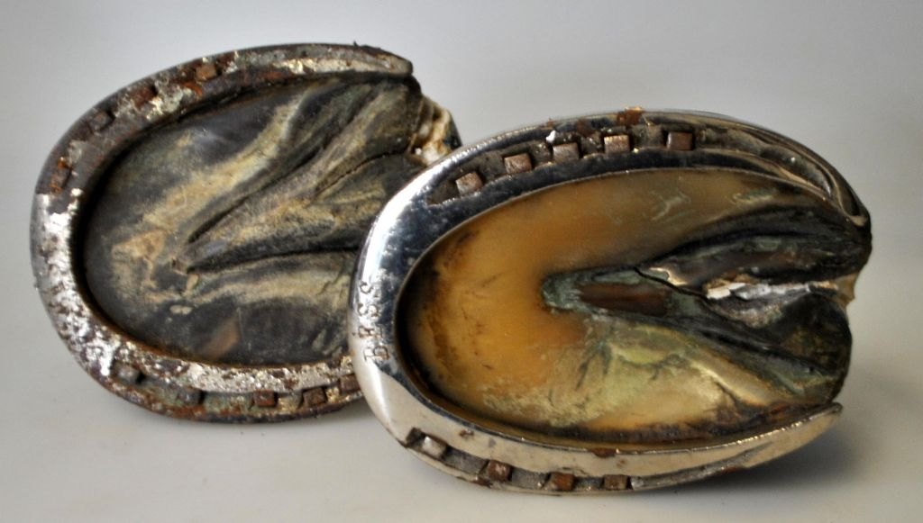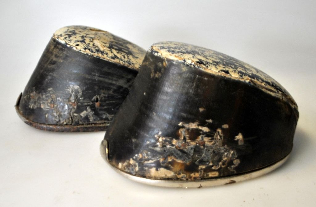 Et par udfyldte hestehove, 20. årh. Væddeløbshesten Bess. Med forsølvet sko. Malet Bess og indgraveret Bess på skoen. H: 7,2 cm. L.: 13,5 cm.