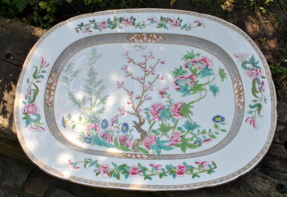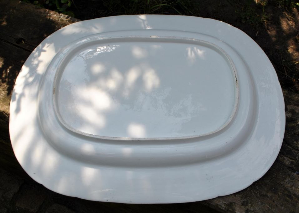 Large English porcelain roasting dish, 19th century. Decorations in transfer technique with hand painting and gilding. Unstamped. L.: 50 cm. W.: 39 cm.