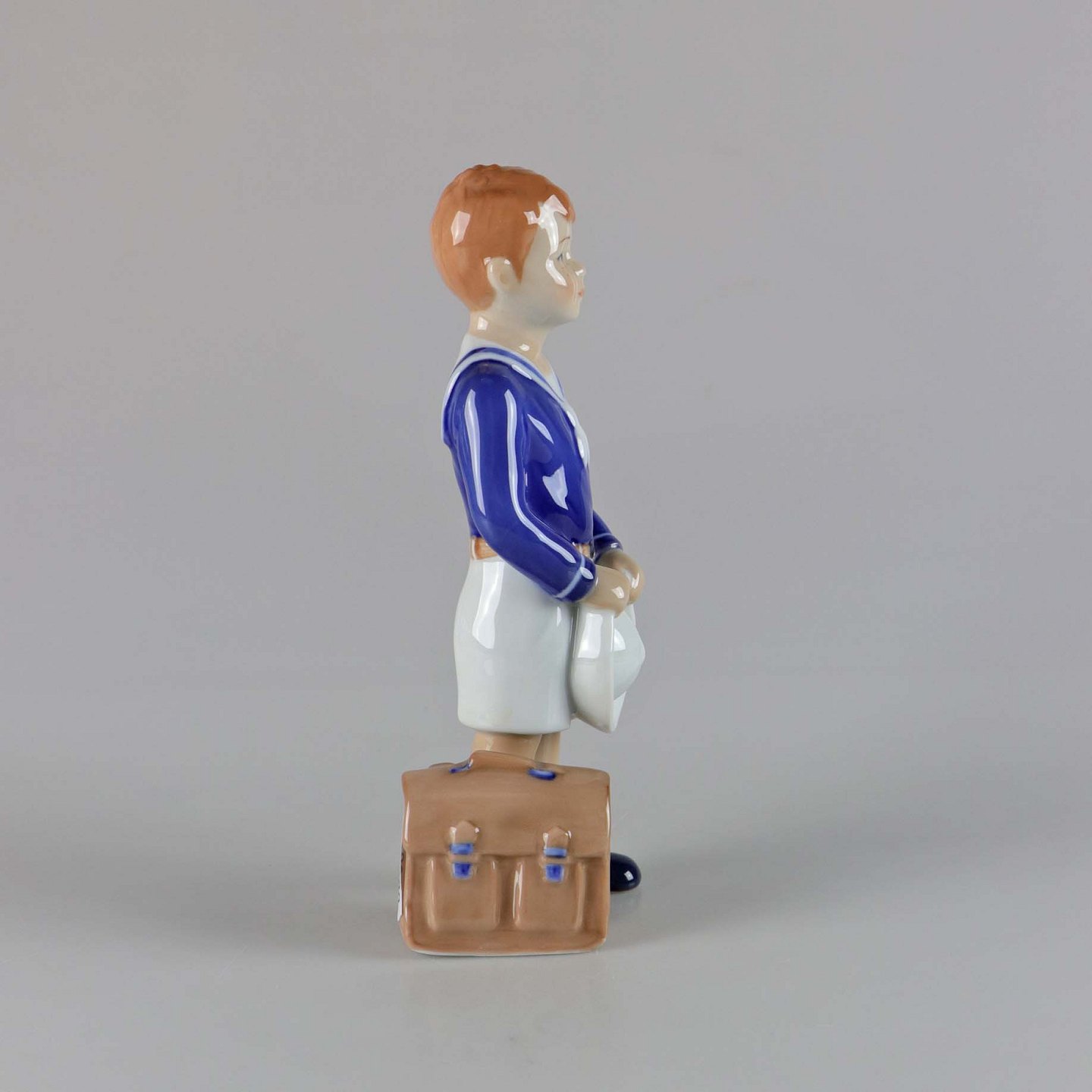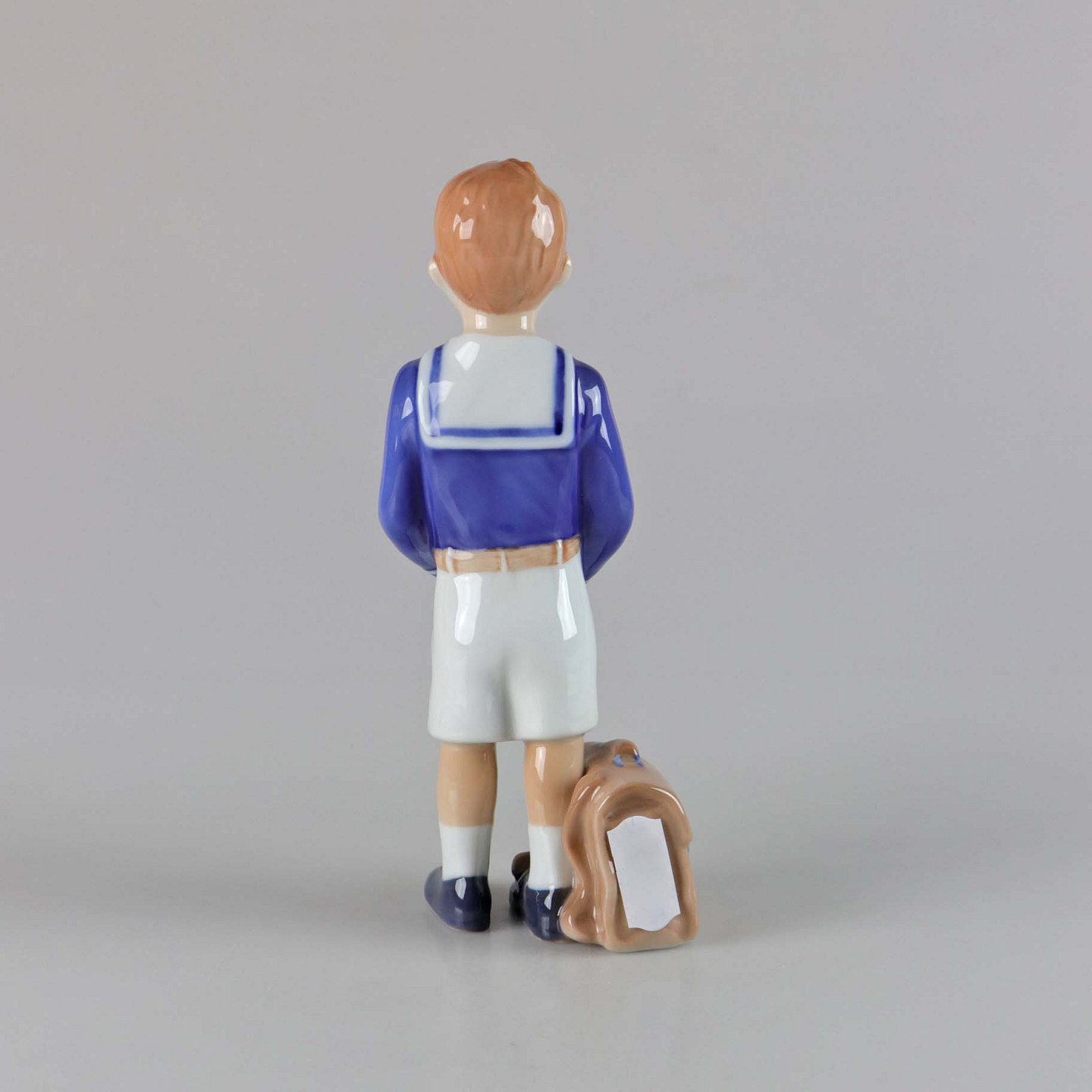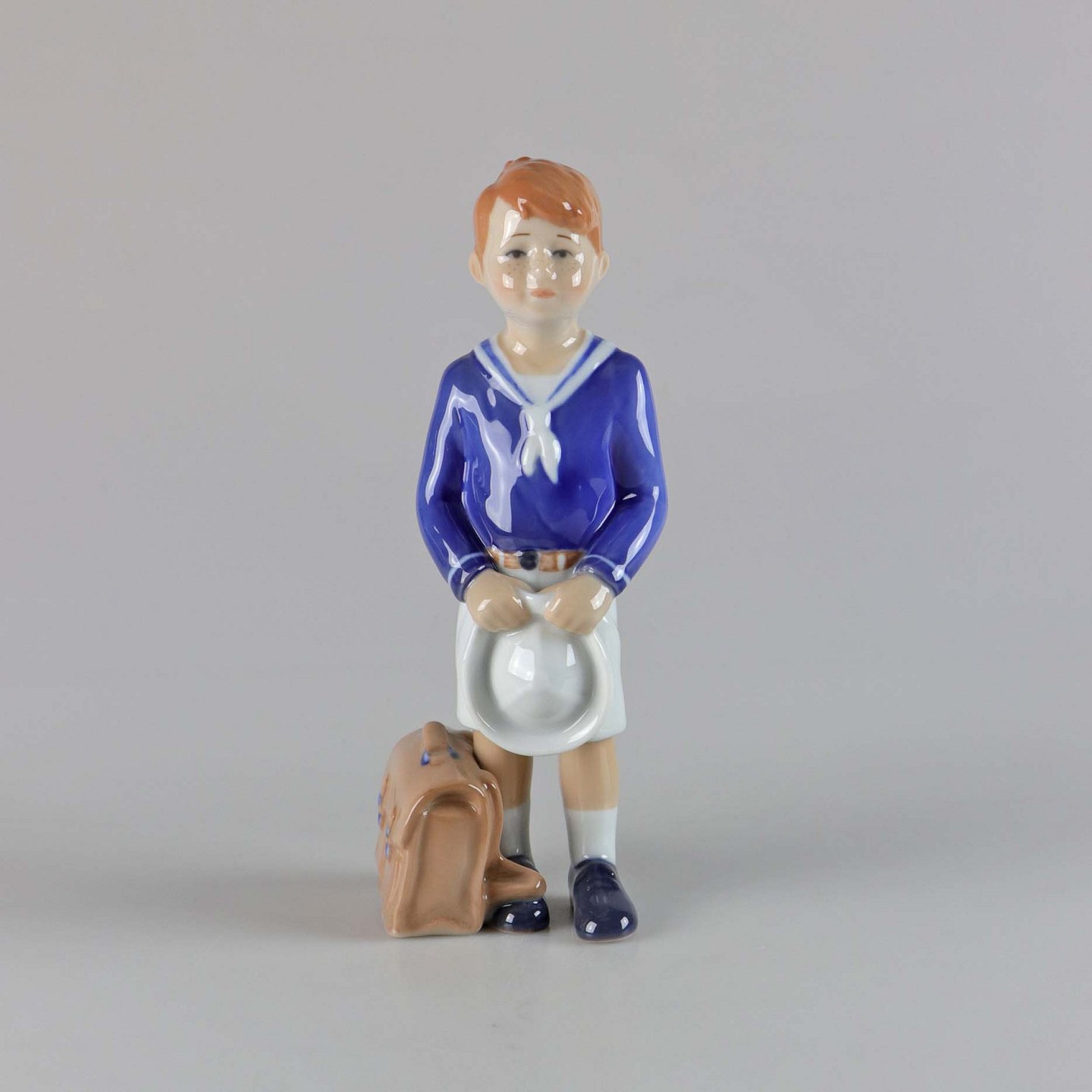 Figur i porcelæn med motiv af en dreng iklædt skoleuniform og med skoletaske no 685