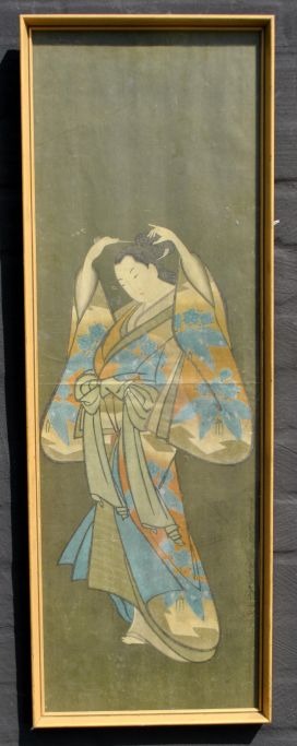 Japanese artist (19th century): A woman in a kimono sets her hair. Colored woodcut. Signed. 74 X 24 cm. Framed: 77 x 27 cm.