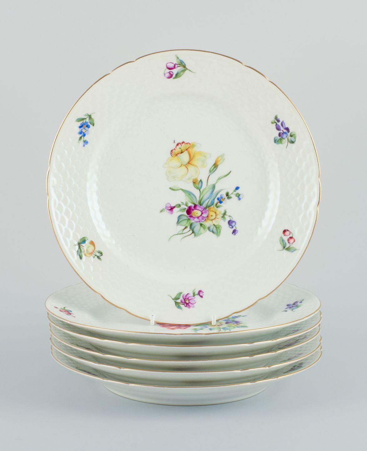 Bing & Grøndahl, Saksisk Blomst, et sæt på seks middagstallerkner hånddekoreret med polykrome blomster og guldkant.