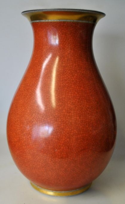 Royal Copenhagen craquelle vase, 212/6547, 20. årh. København, Danmark. Grå qraquelle glasur med orange overglasur og forgydlninger. Stemplet. Højde.: 30,2 cm.