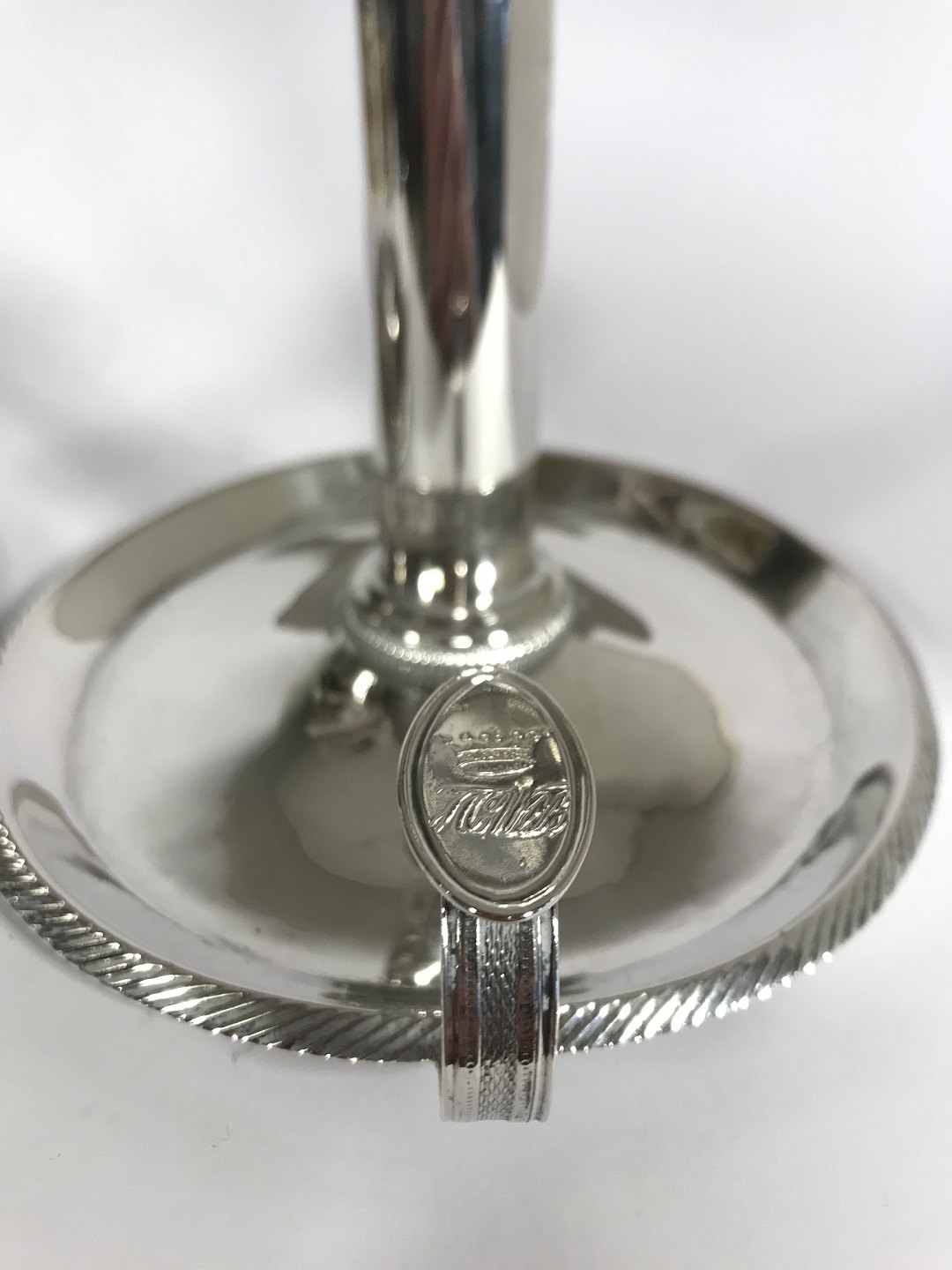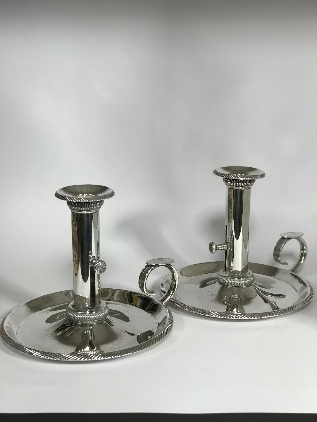 Et par Empire kammerstage af sølv. Mester Rasmus Theilgaard. Odense 1821. Graveret med krone og monogram på hank. . Højde 12 cm. Vægt 648 gram.