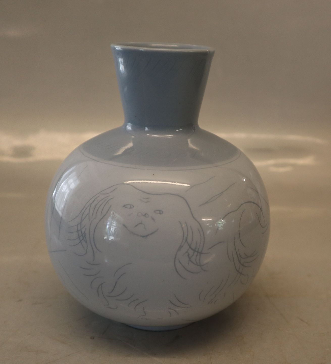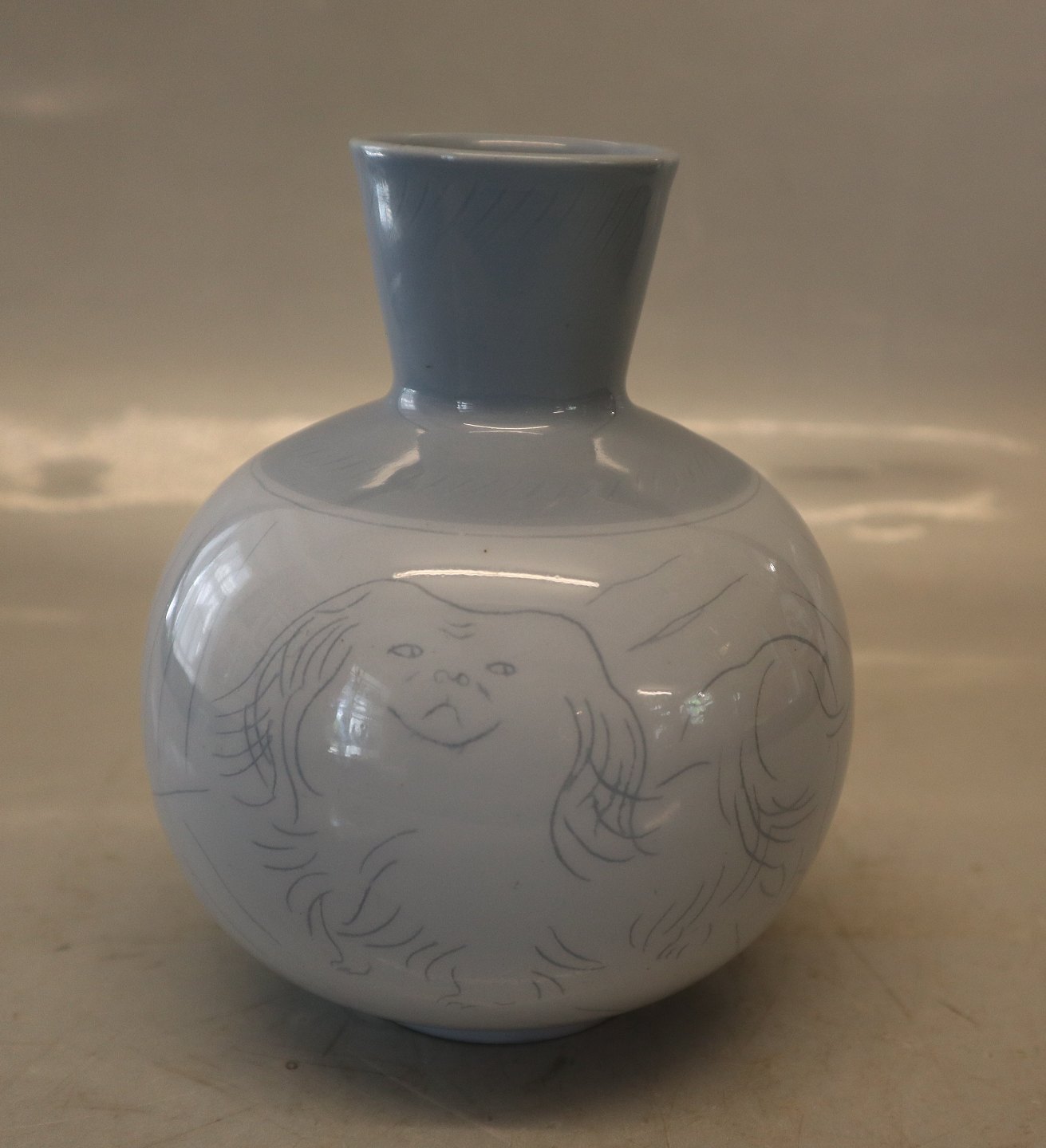 Unika Dansk B&G Vase med stiliseret tegning af pekingeser hund og siameser kat 14.5 cm Ebbe Sadolin stentøj