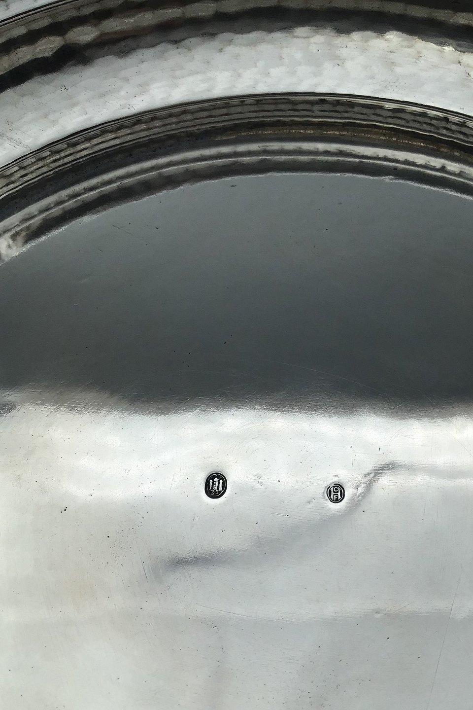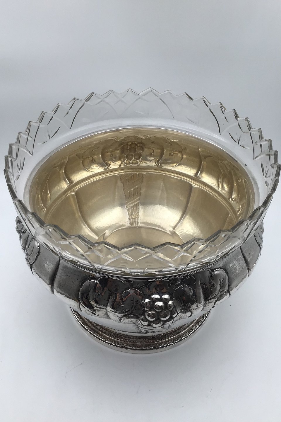 Dansk Sølv Frugtskål med glasindsats (1921) Måler Sølvskål H 18 cm (7.08 inch) (incl glasindsats 22.5 cm (8.85 inch)) Diam 30 cm (11.81 inch) Samlet vægt 2712 gr (95.66 oz) (Små glasafslag)