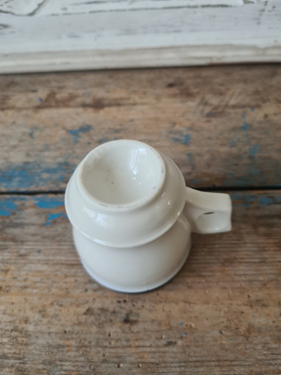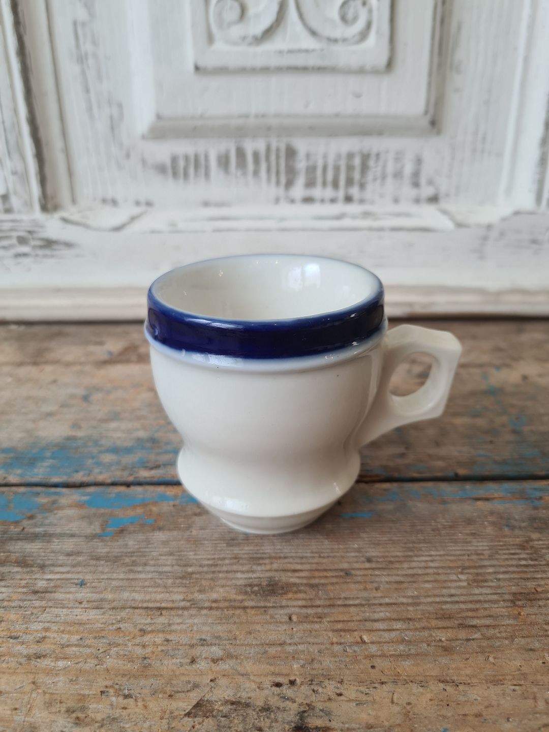 Fransk café brûlot kop i kraftigt jern porcelæn dekoreret med blå striber