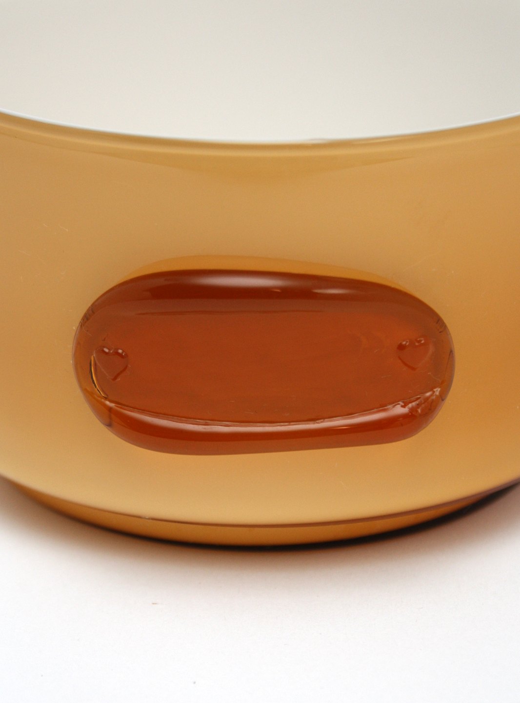 Holmegaard, Palet, Karamel køkkenserie. Skål til opbevaring med blank neutral etikette. Designet af Michael Bang i 1973, udgår i 1976. Højde 7 cm. Diameter 11,2 cm. Pris: 275 kr.