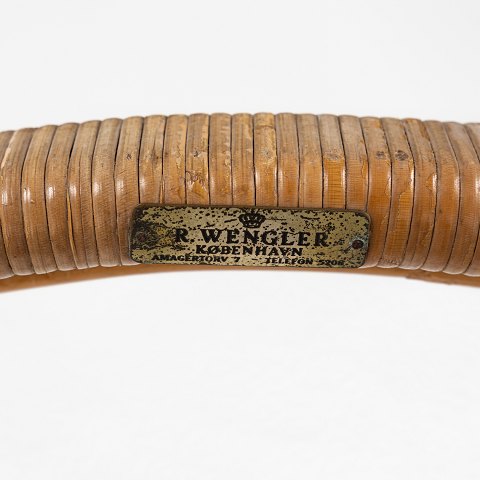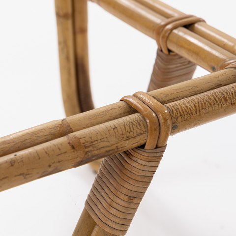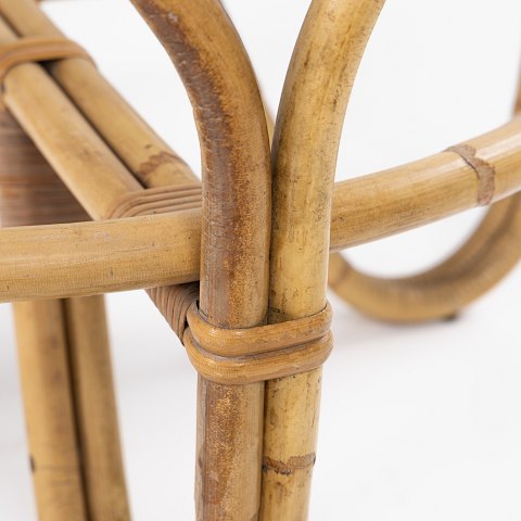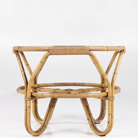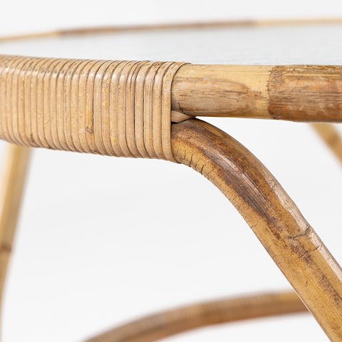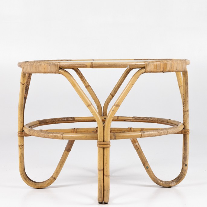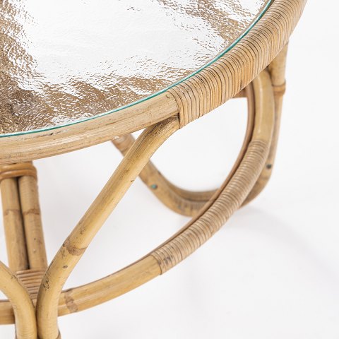 Rundt sofabord i bambus med plade i råglas og underliggende hylde.