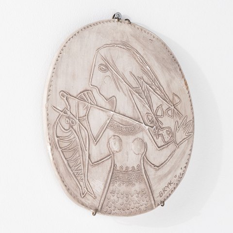 Unikt relief i stentøj med motiv af en kvinde som fisker. Signeret.