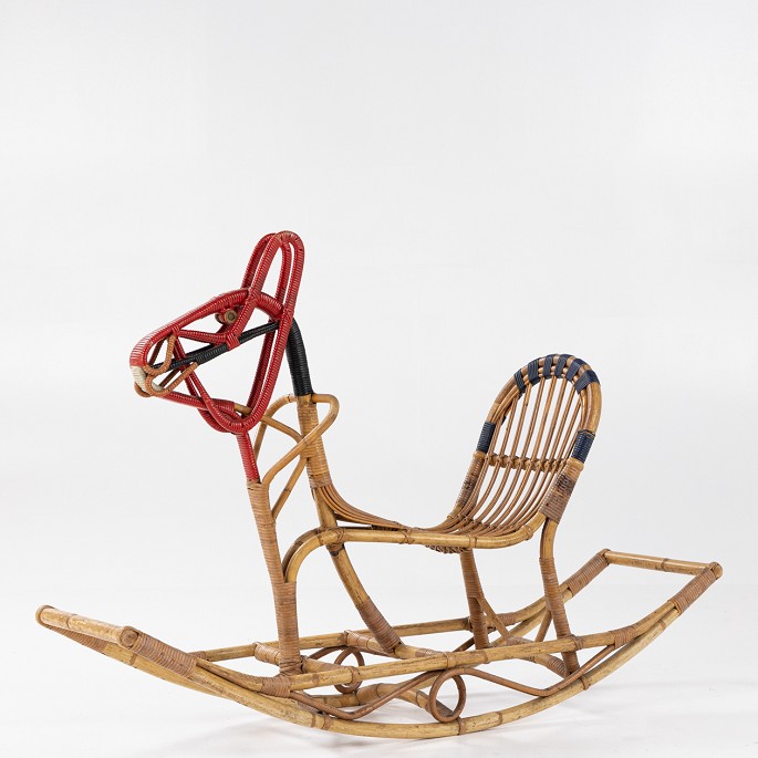 Model nr. 35 - Gyngehest i flettet bambus, beviklet med sjener og farvet plast.