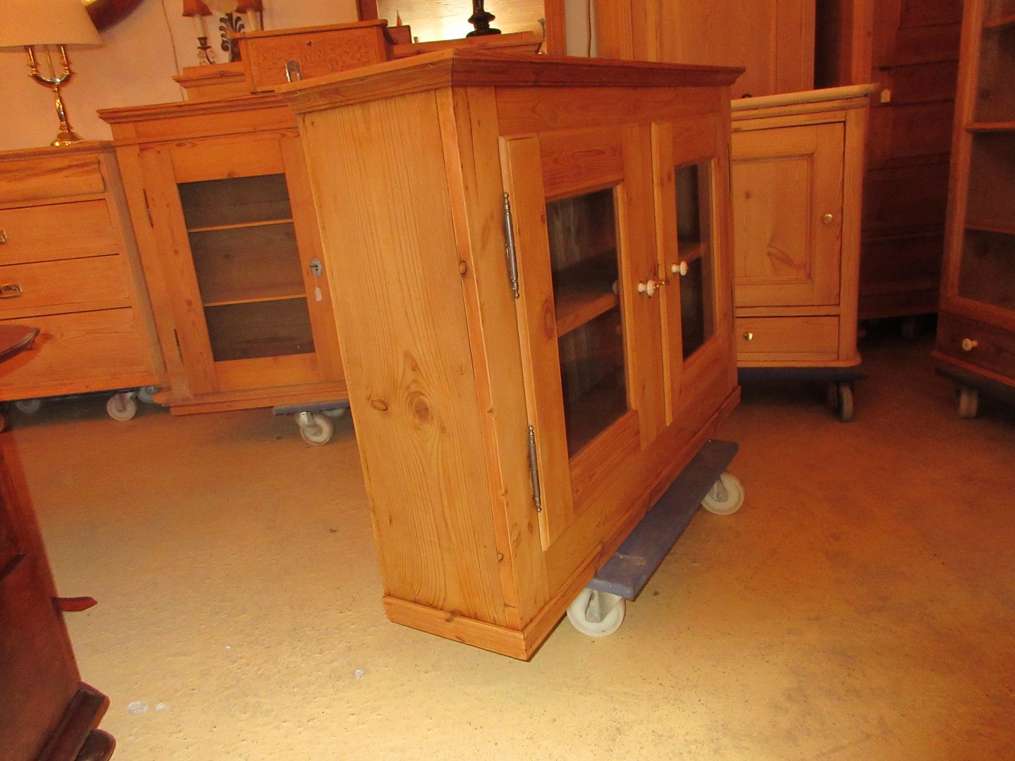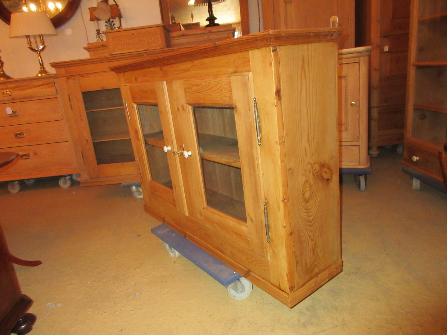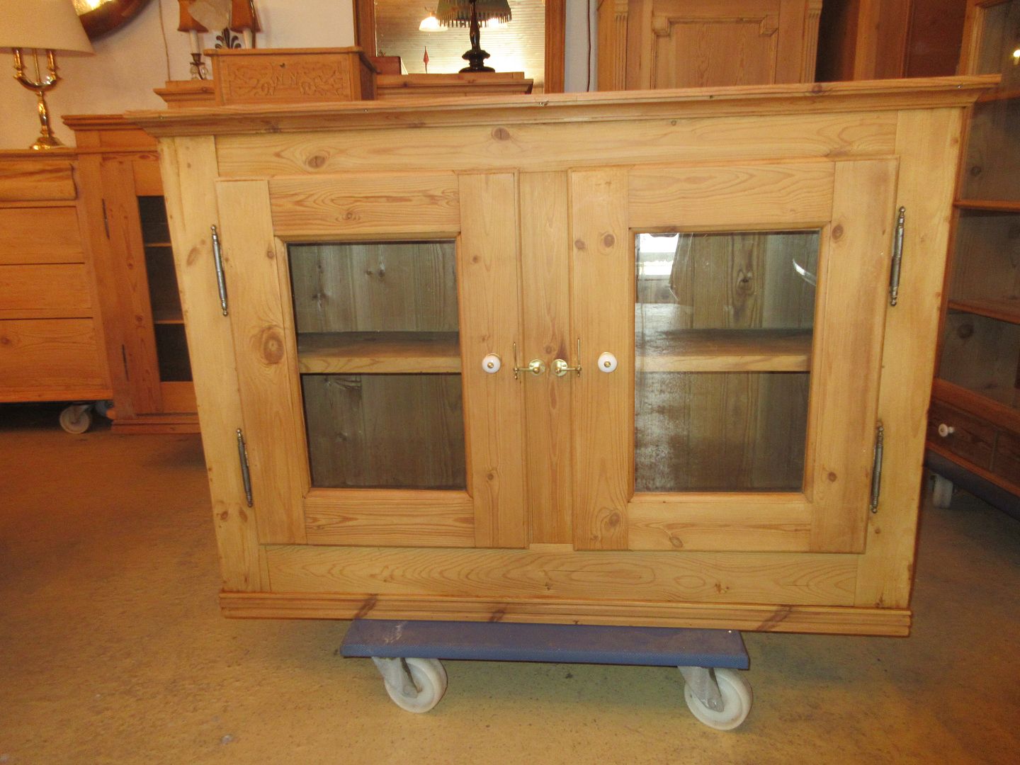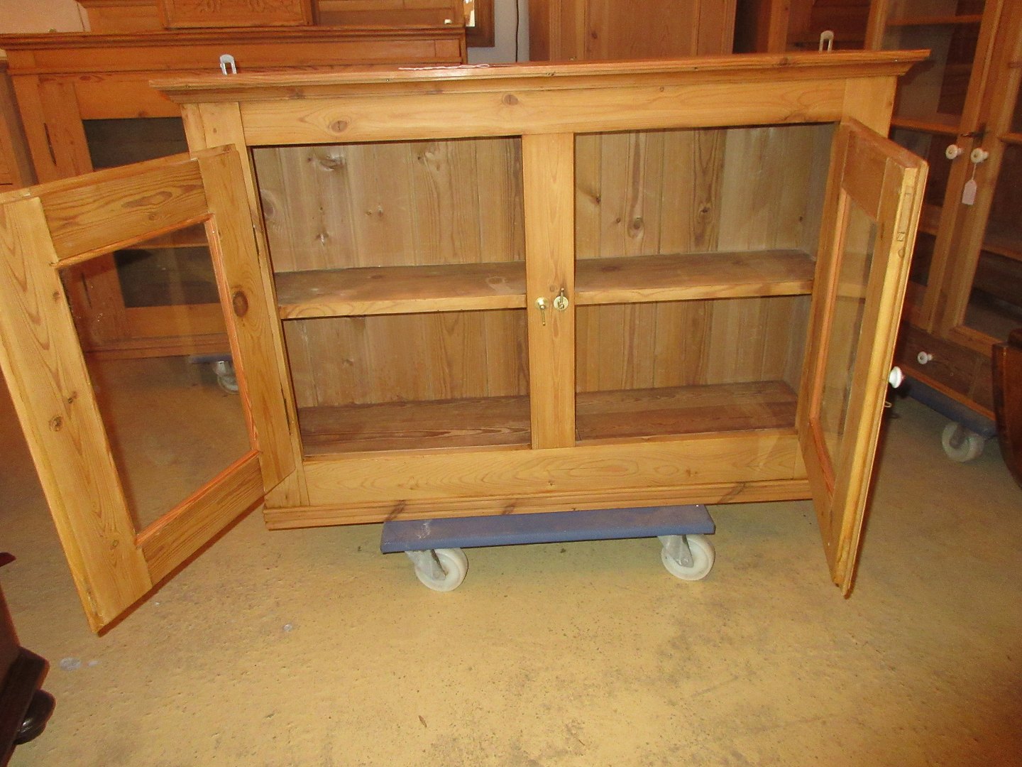 Vitrineskab afsyret fyrretræ med 2 glaslåger restaureret og i fin stand Mål H 78, D 27.B 112,cm