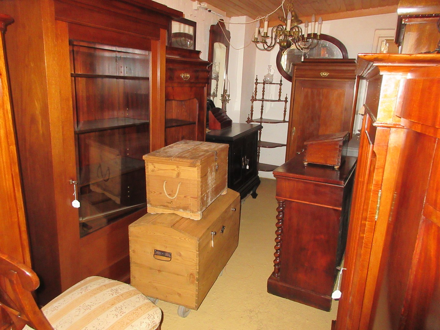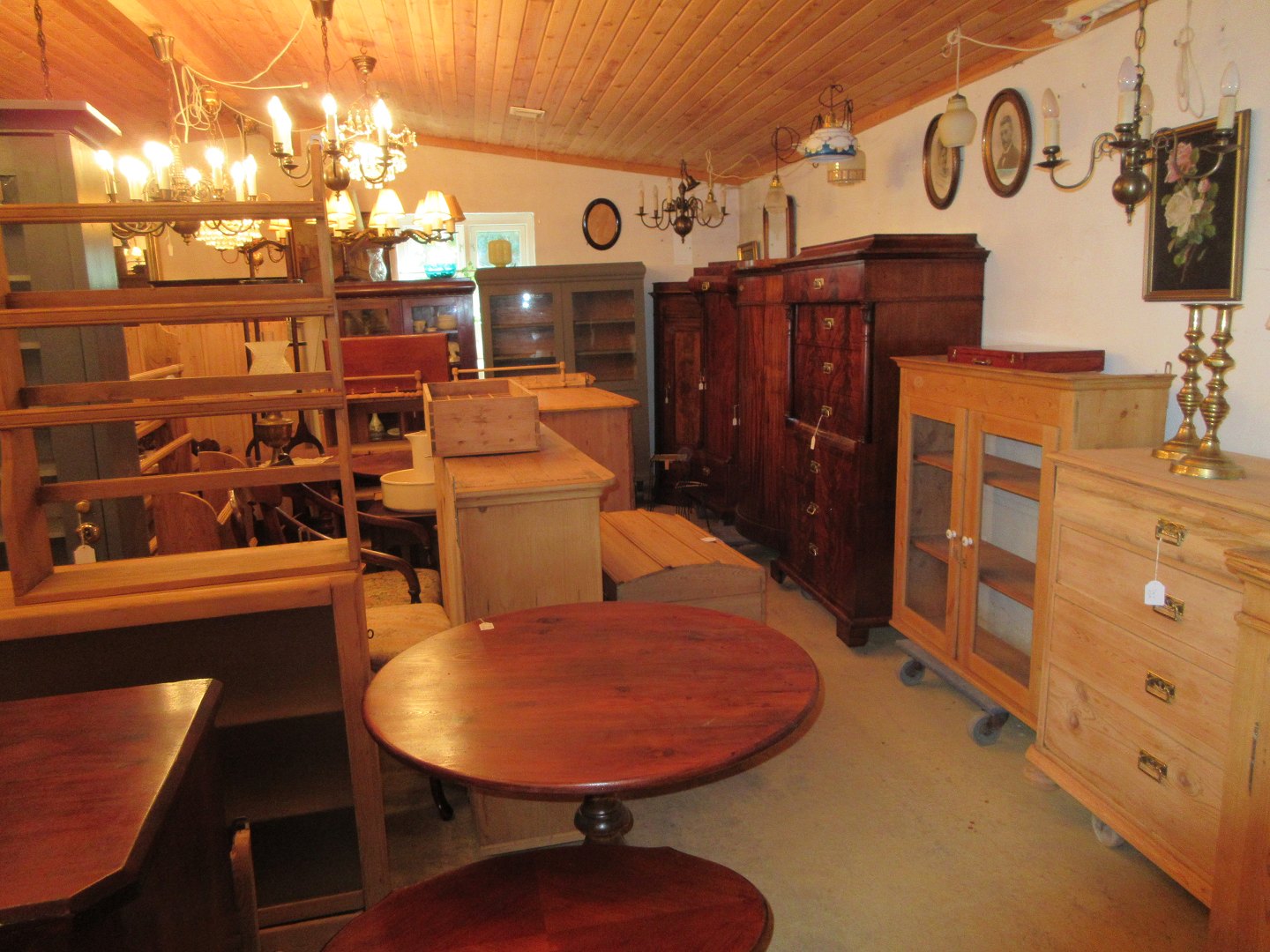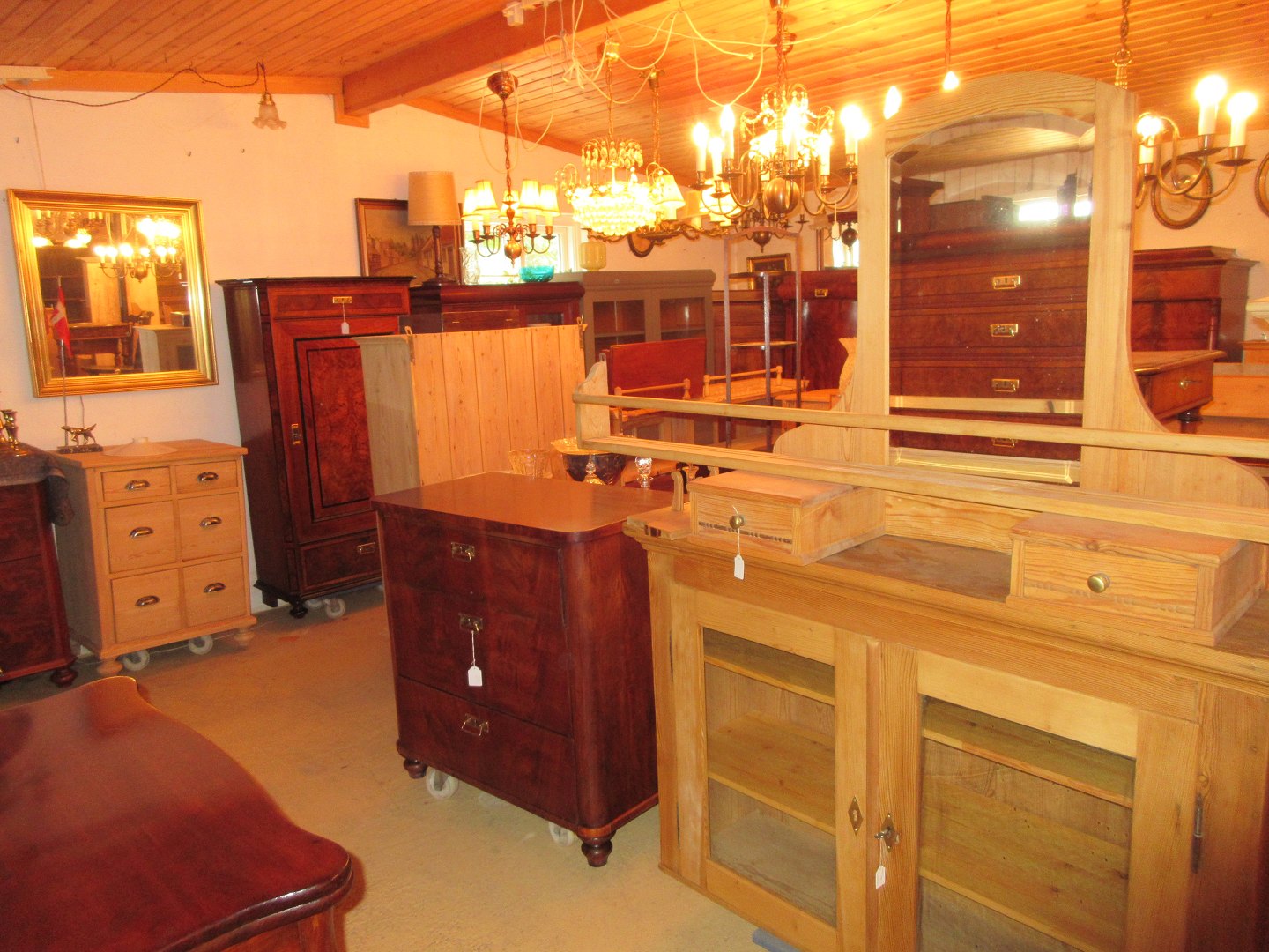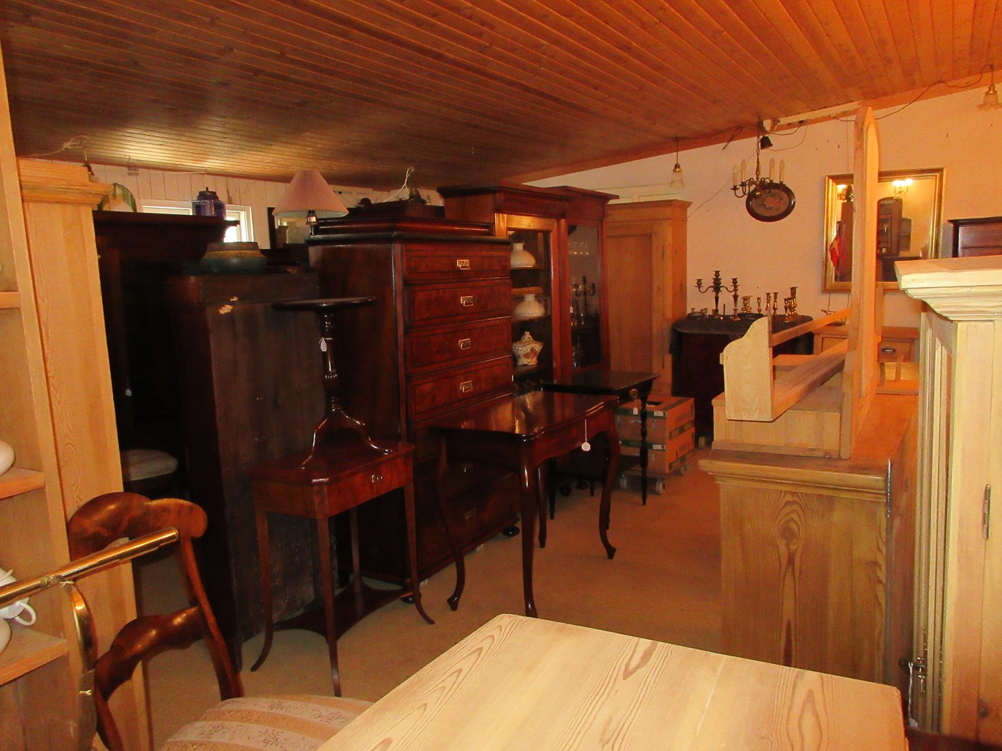 Stor salgsudstilling med restaurerede møbler håndpolerede mahognimøbler, afsyrede fyrretræsmøbler, malede træmøbler, kun originale gamle og antikke møbler.