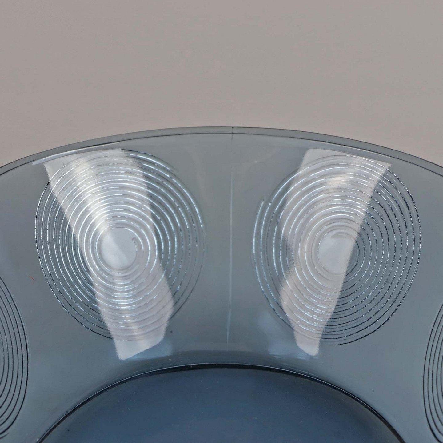 Blå mundblæst glas fad fra serien Skjold, dekoreret med spiraler