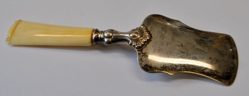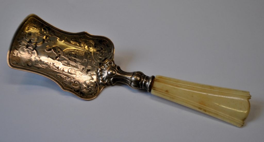 Lille sølvspatel med rococo dekoration af smørkærnende kvinde, 19. årh.