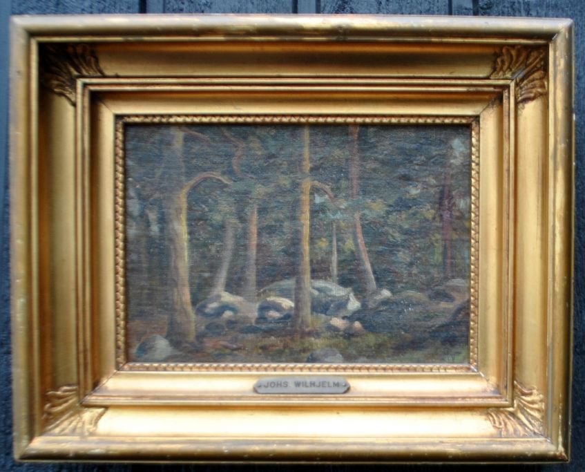 Wilhjelm, Johannes (1868 - 1938) Danmark: Sten i en skov. Olie på lærred. Signeret. 16x 24 cm.