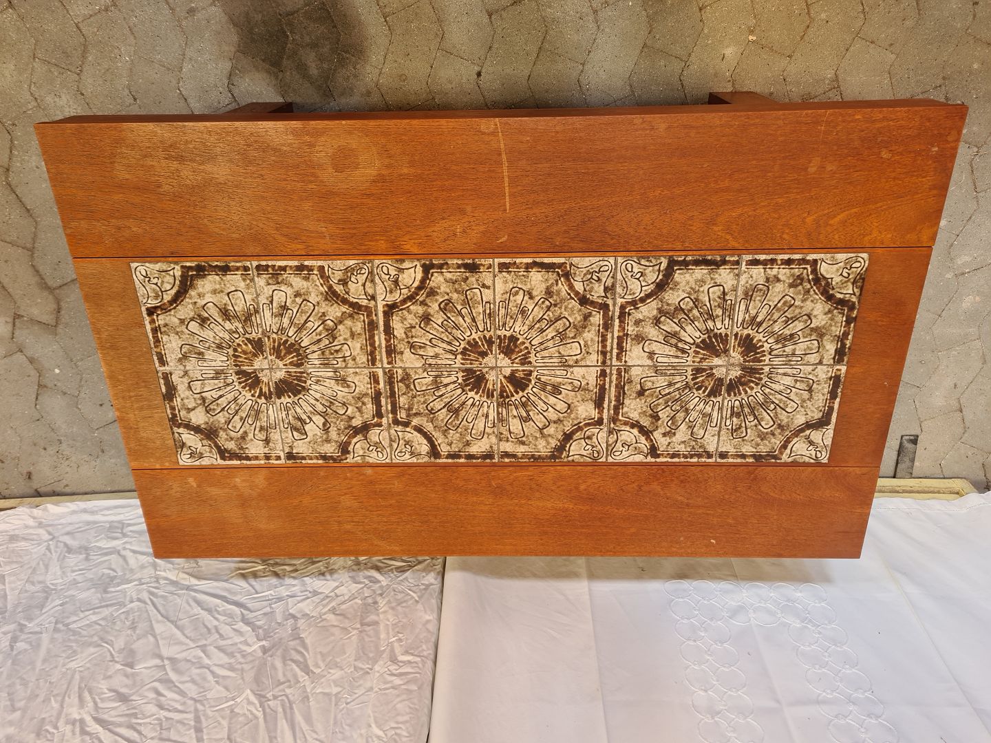Sofabord i fineret og bejdset egetræ med kakler, fra 1970erne.