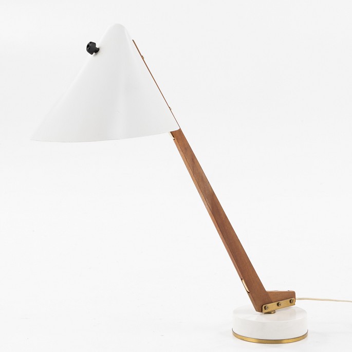 Model B54 - Bordlampe i hvidt metal og arm af teaktræ.