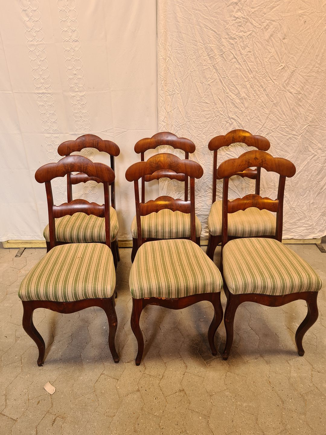 6 Salonstole i massivt bøgetræ med fineret mahogni, fra 1900erne.