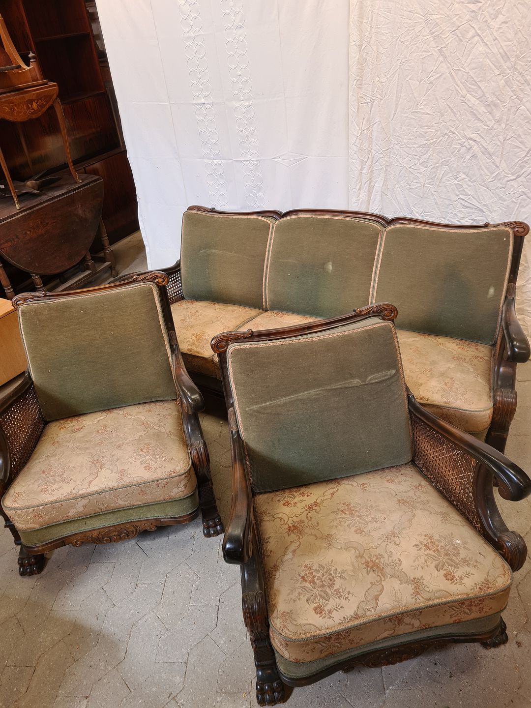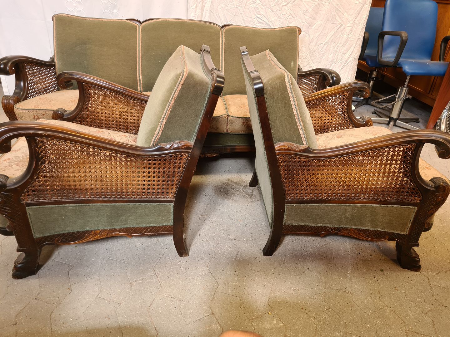Sofa og 2 lænestole i nødetræ med rørflet, fra 1930erne.