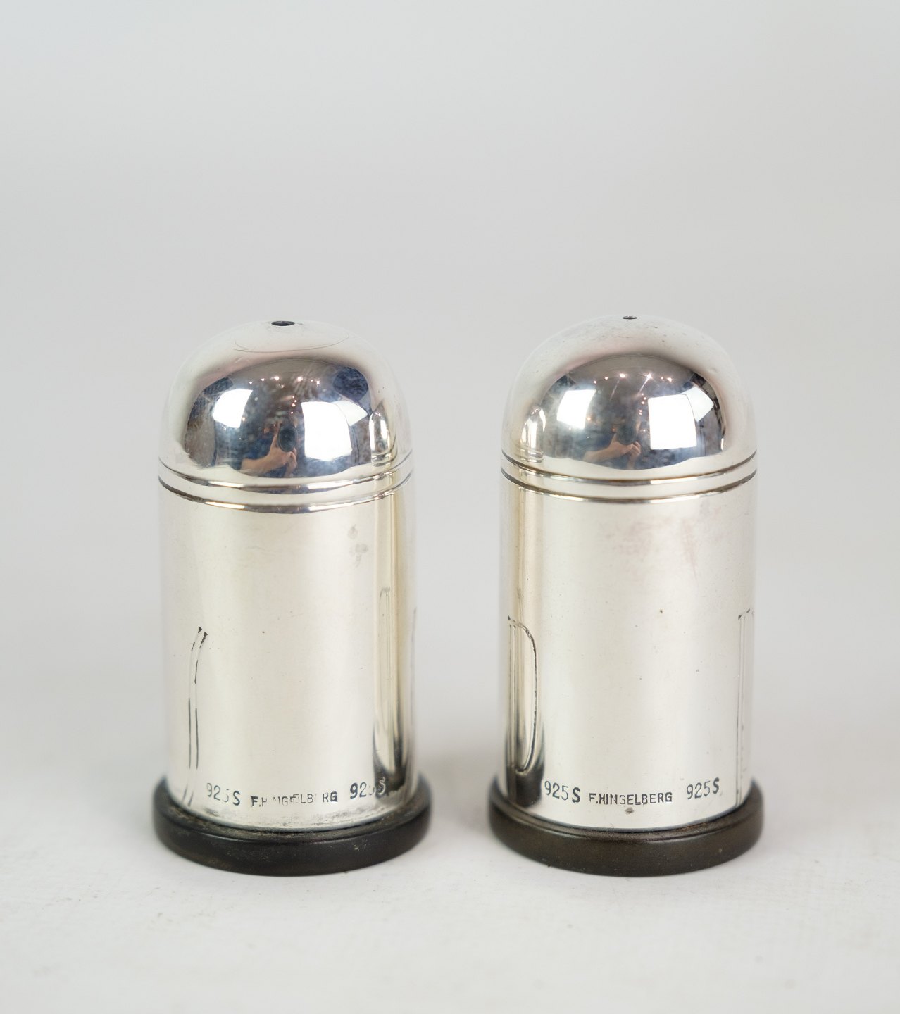 Salt og peber sæt i minimalistisk design, stemplet 925 sterling, samt mesterstempel. F. Hingelberg. Vægt: 41g
