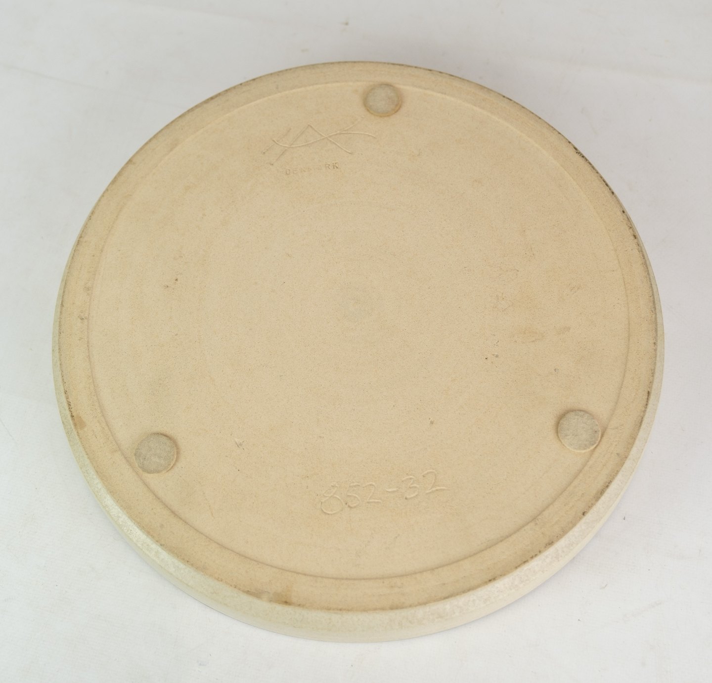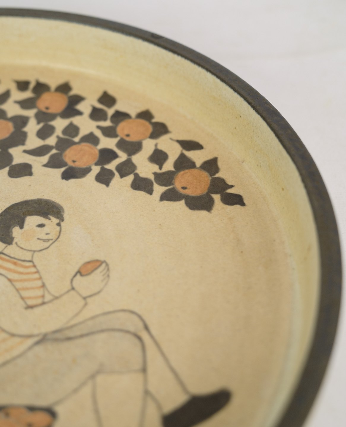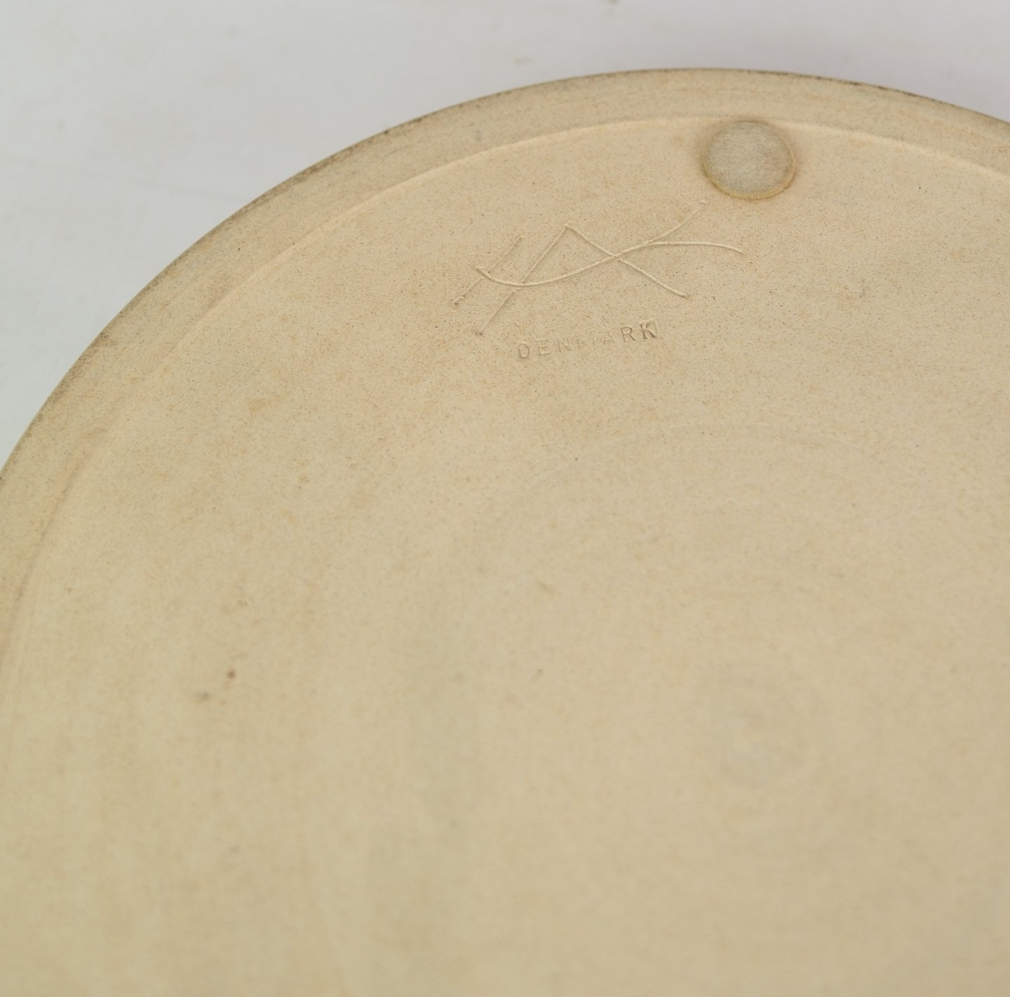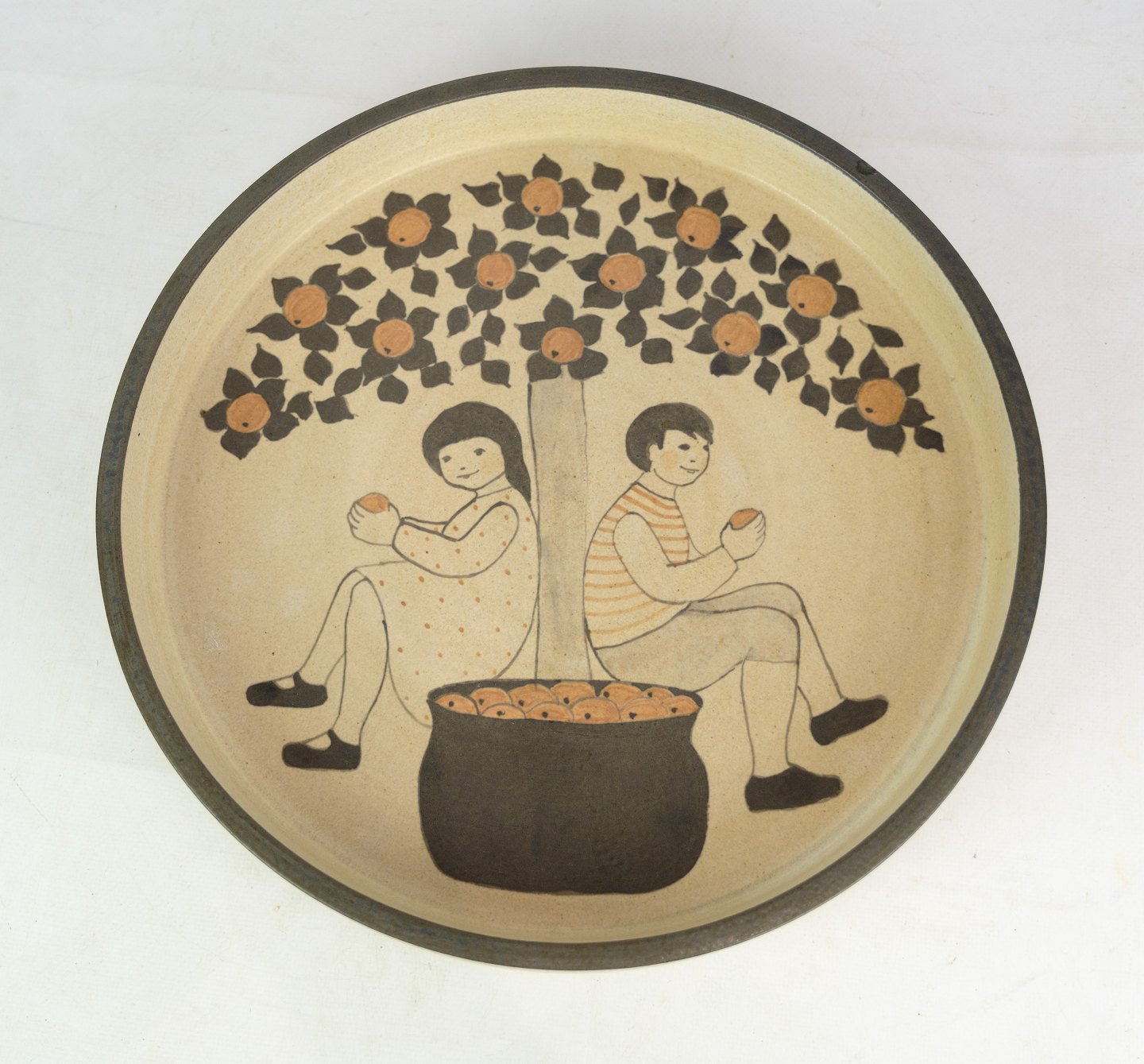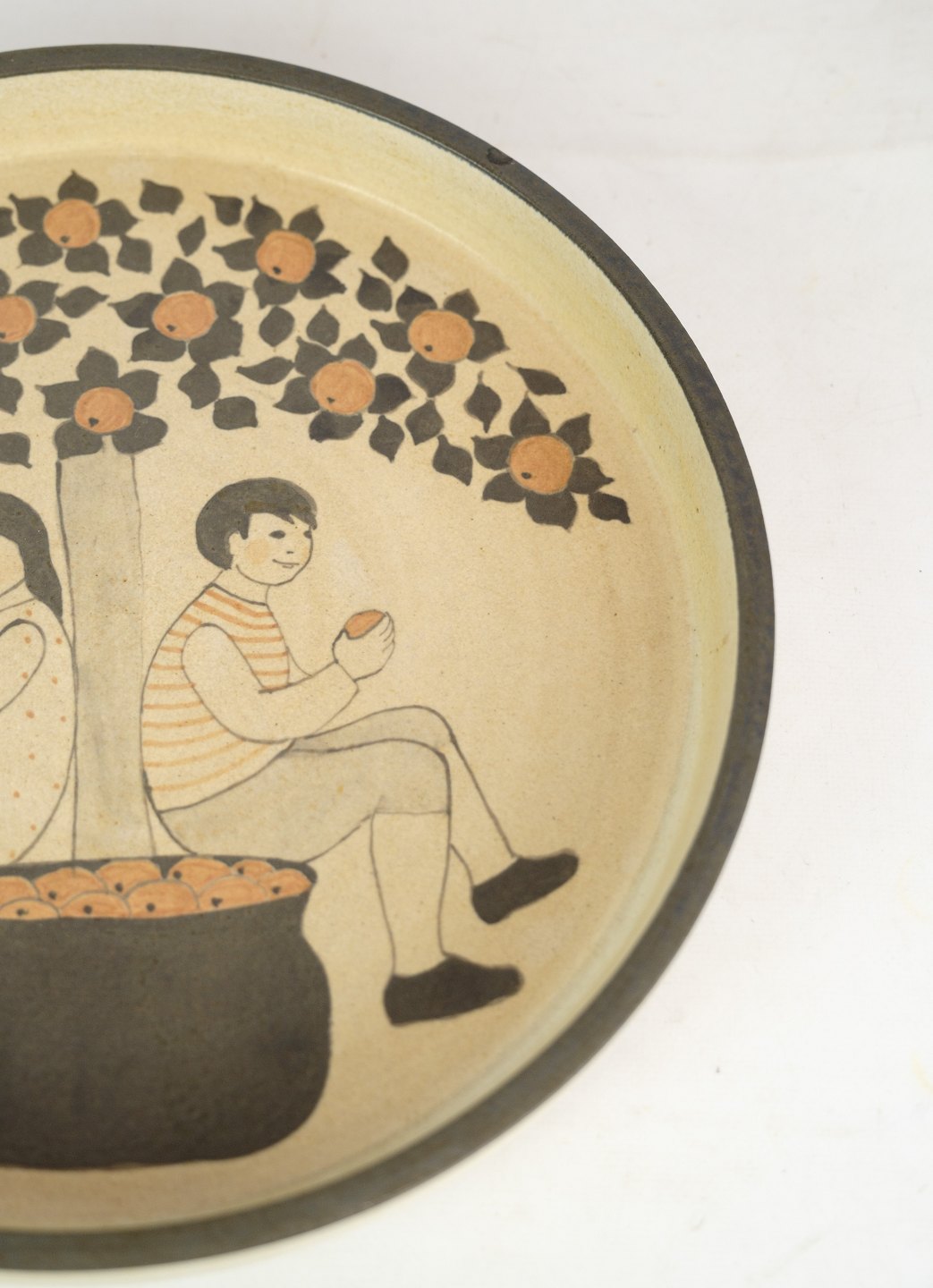 Rundt keramik fad af Herman Kähler med motiv af Adam og Eva. Flot stand uden skader.