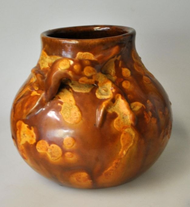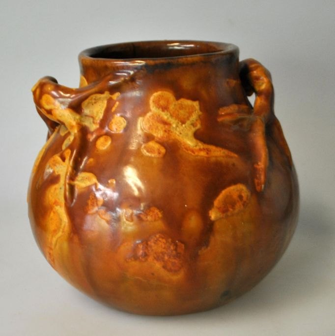 Danish art nouveau vase, 19th century. Yellow/brown glazed. Handle in the form of branches. Unsigned. H.: 13.5 cm.