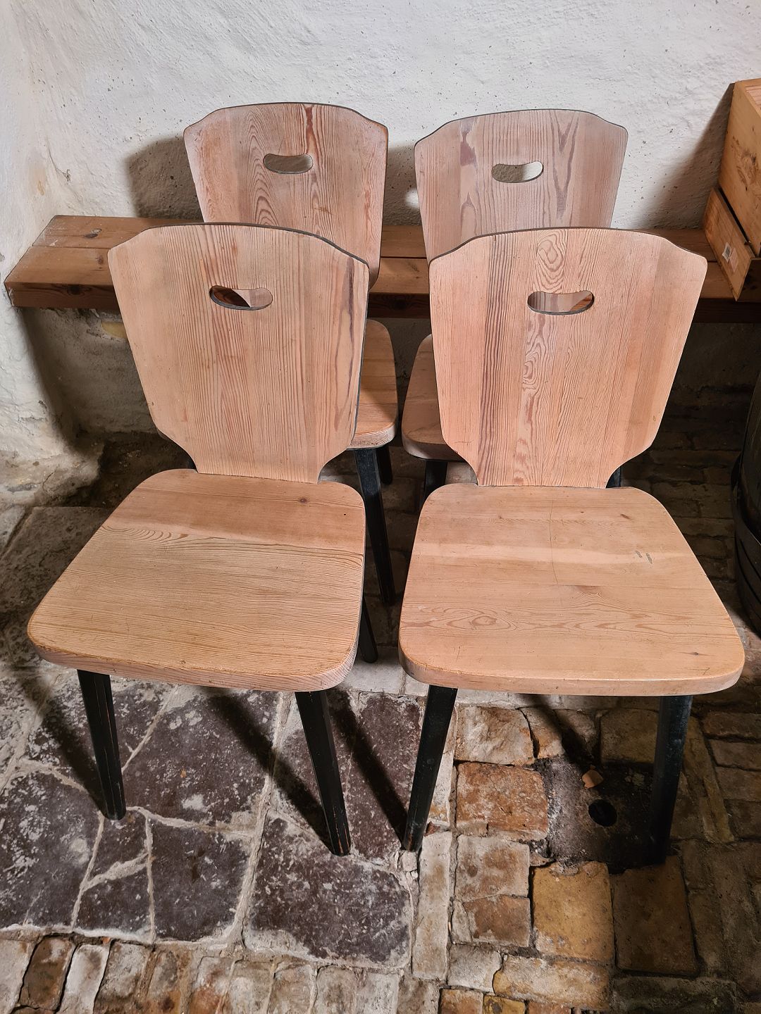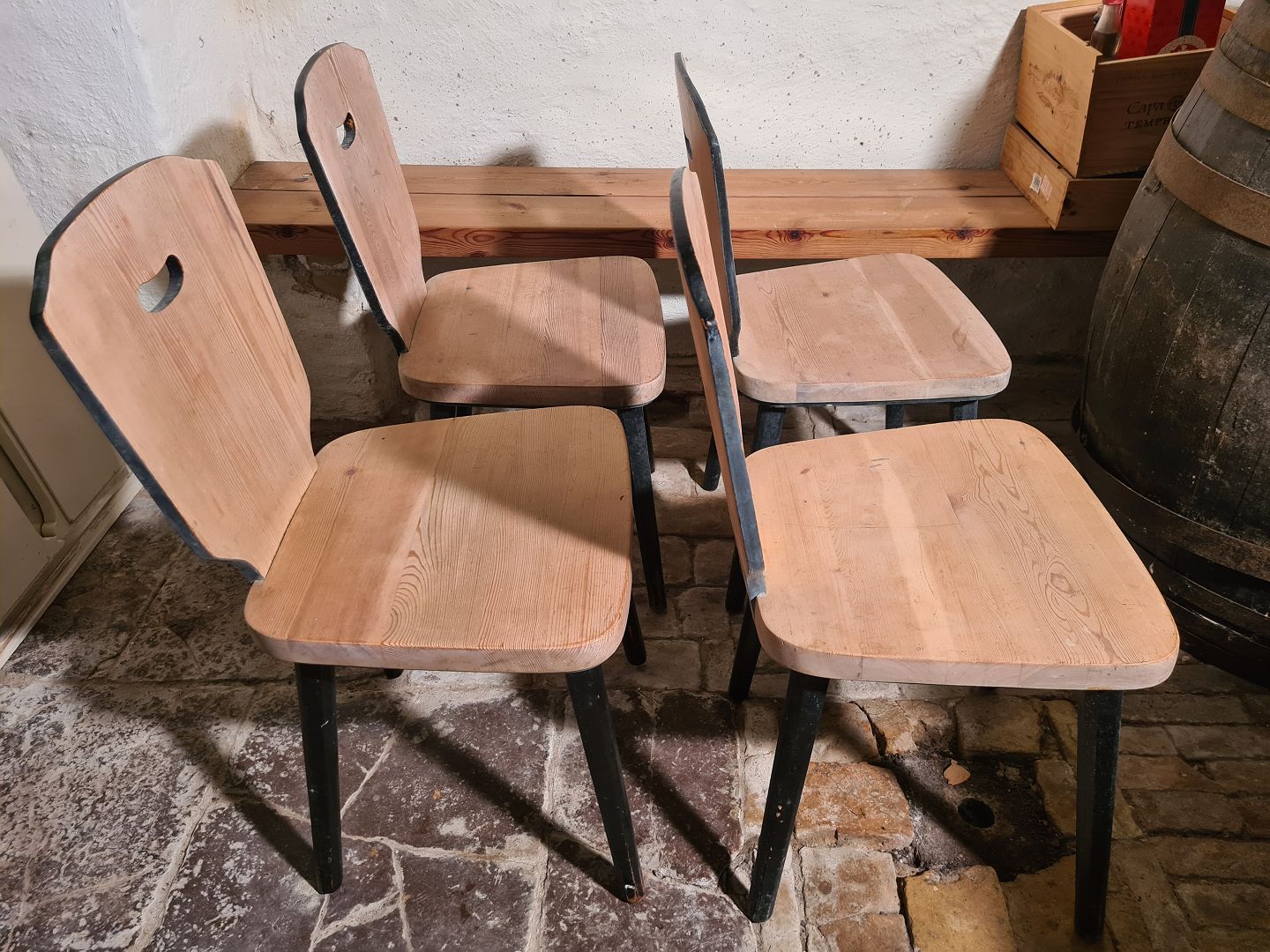 4 spisebordsstole i fyr med ludbehandlet ryg og sæde og sortmalede ben. Fremstår udmærket stabile.