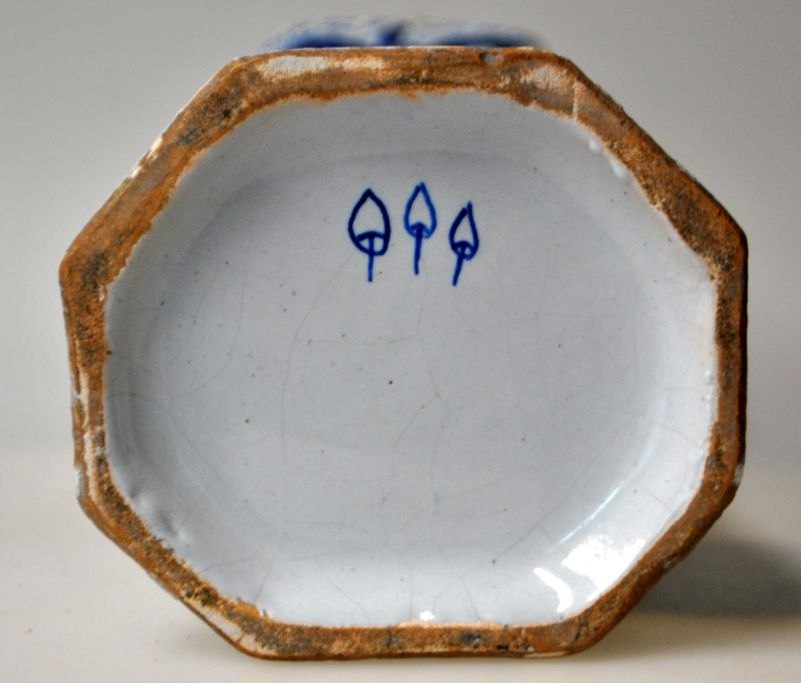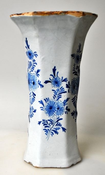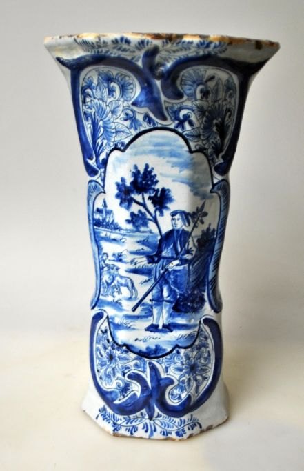 Delft blå - hvid vase, 19./20. årh. Håndmalede dekorationer af hyrder på en mark. 8 kantet, Stemplet i bunden. H.: 24,5 cm