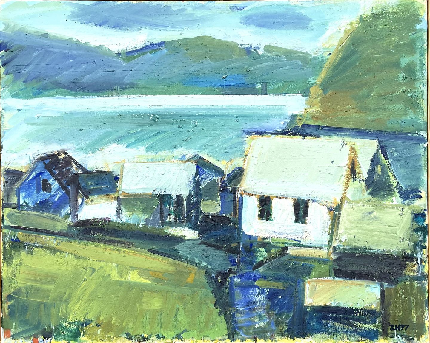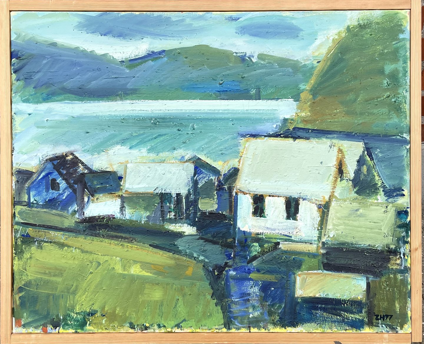 "Motiv fra Færøerne" Oliemaleri i bred naturramme.
