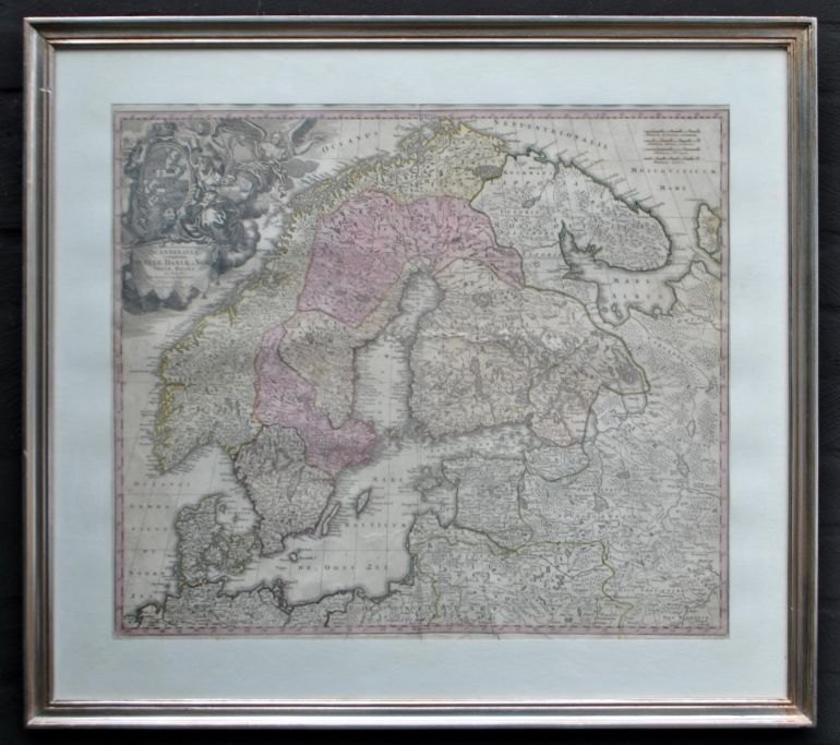 Homann, Johann Baptist (1663 - 1724) Tyskland:  Kort over Skandinavien. Håndkoloreret kobberstik. Signeret. 48 x 58 cm.