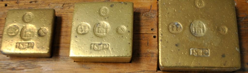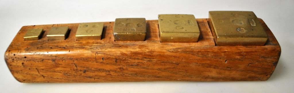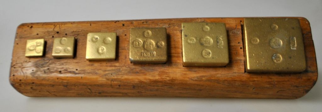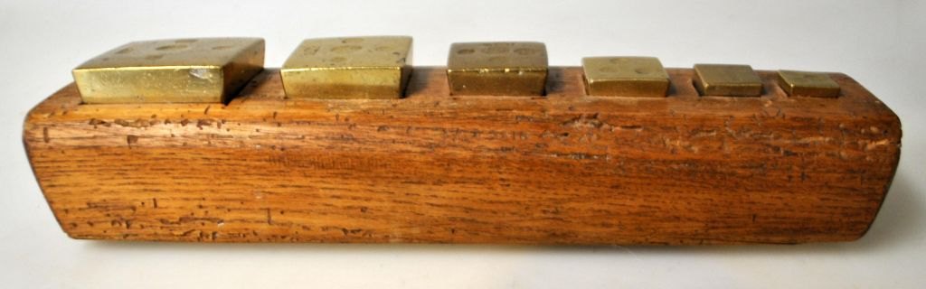 Sæt med danske vægt lodder i messing, 1842. Bl.a. 1/4 pd, 1/2 pd og 1 pd. L.: 26 cm.