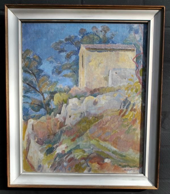 Friis, Andreas (1890 - 1983) Danmark: Sydlandsk landskab med hus. Olie på lærred/masonit. Signeret 1949. 60 x 49 cm.