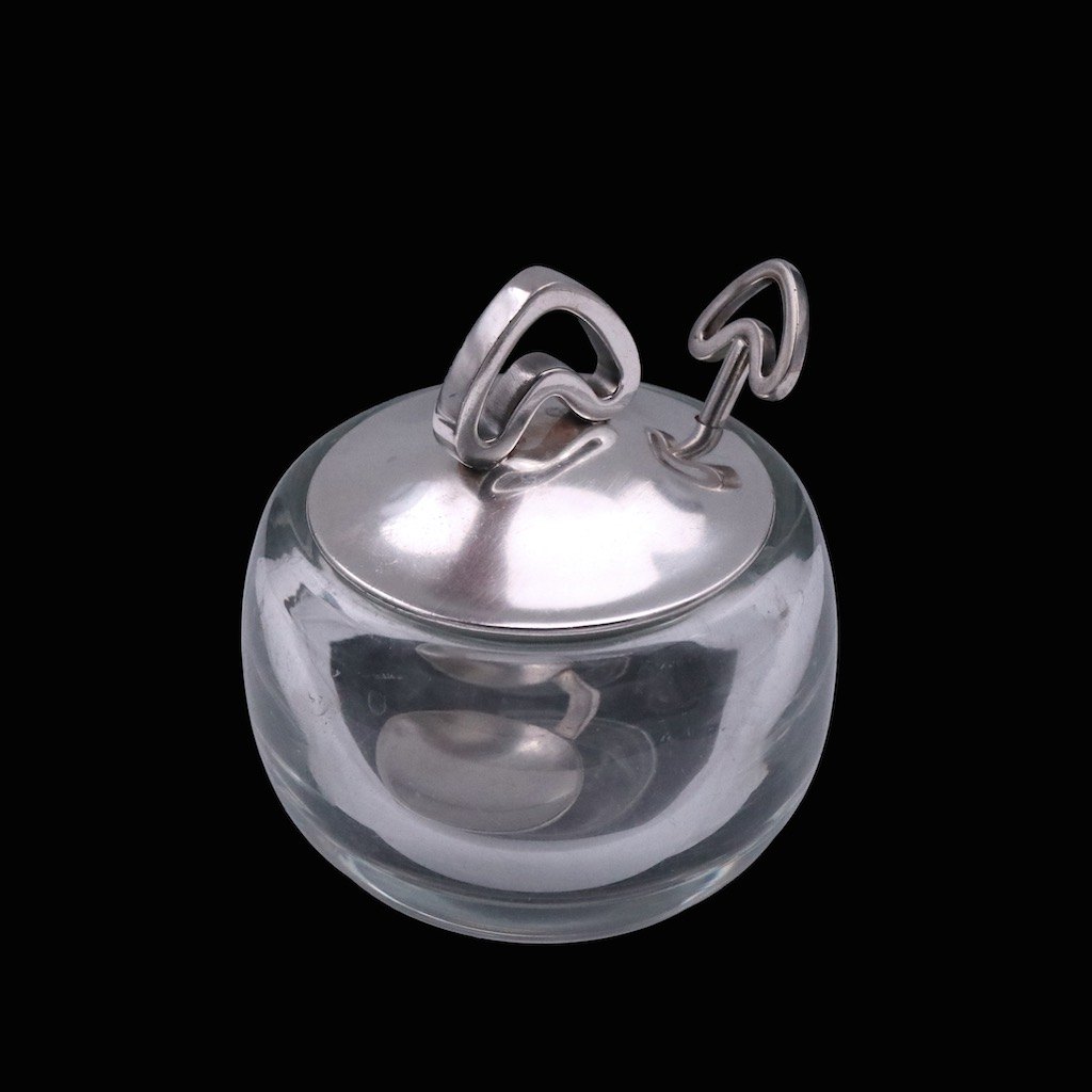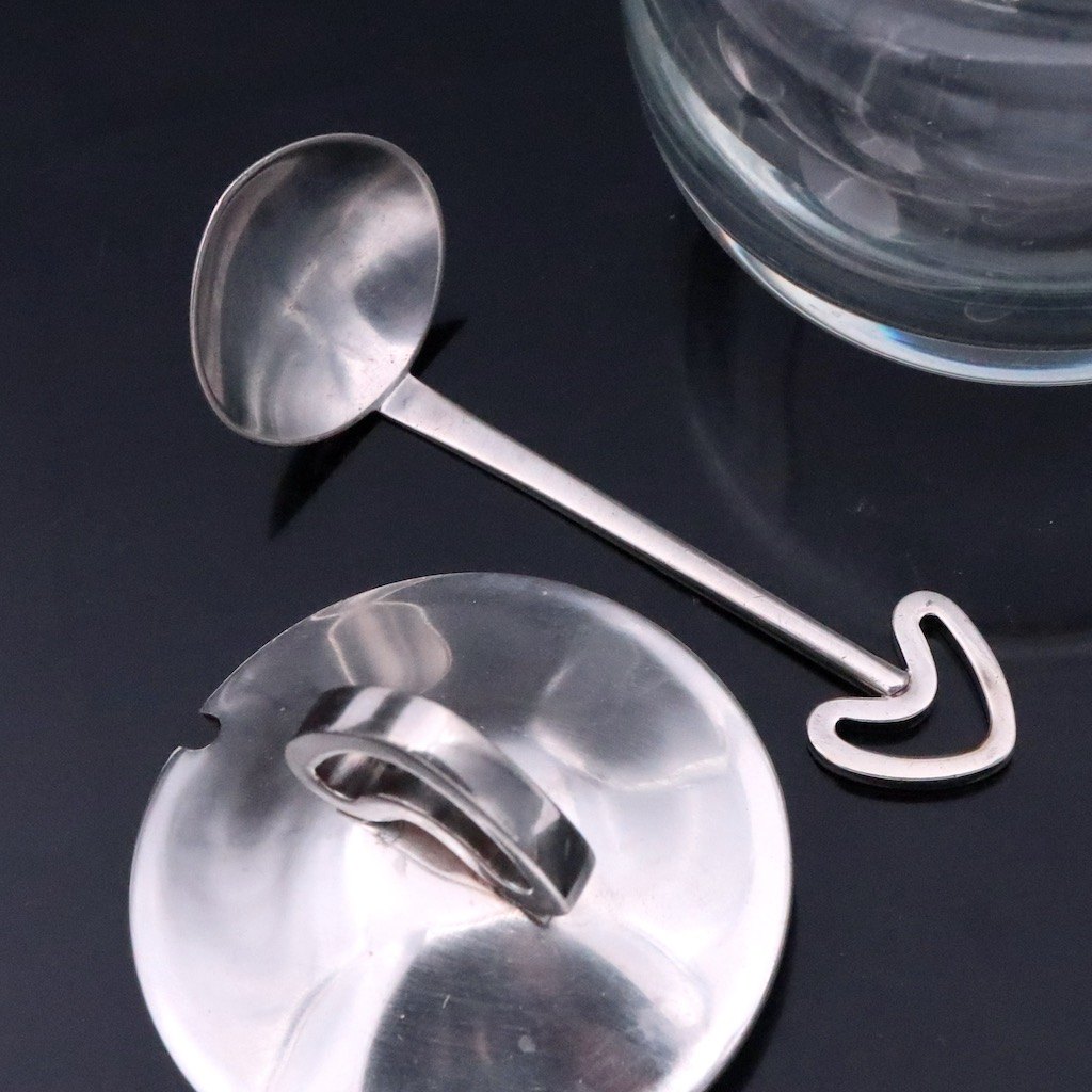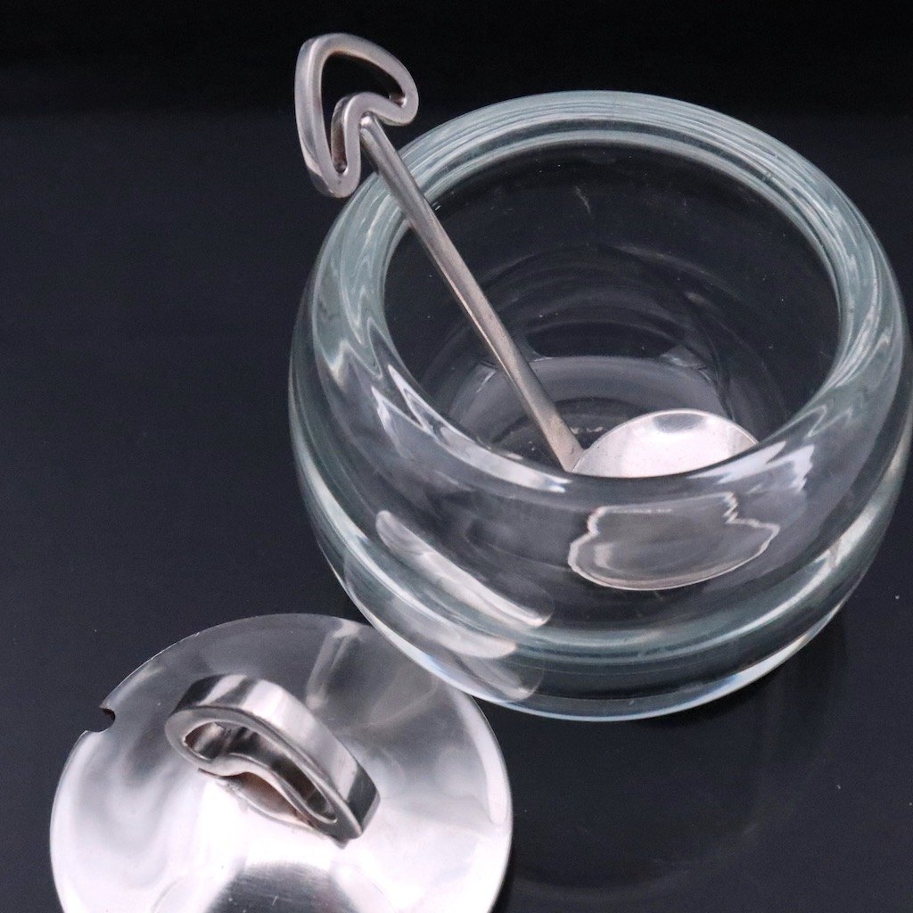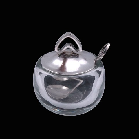 Svend Weihrauch / F. Hingelberg. Krukke i glas med låg og ske i sterlingsølv.