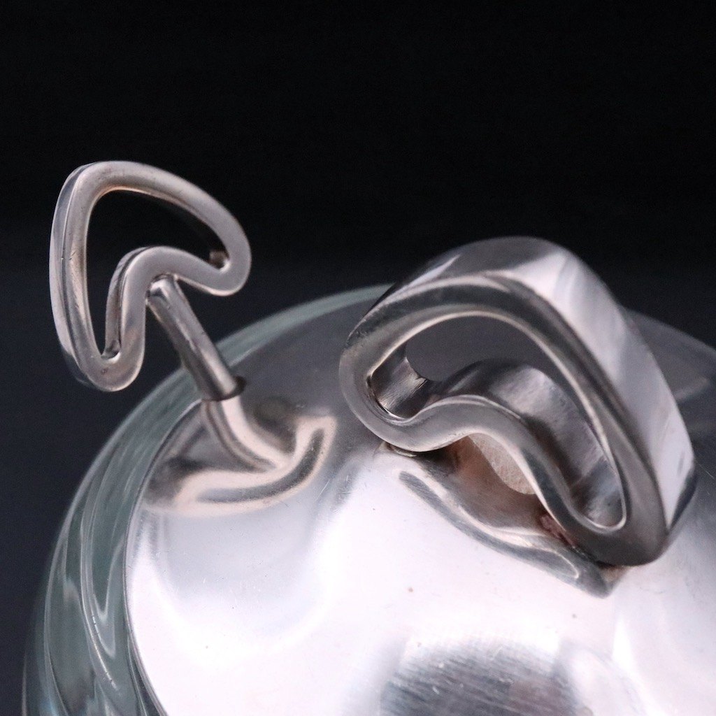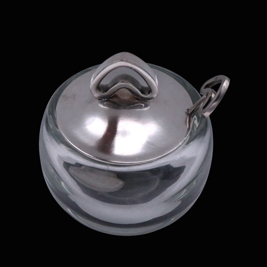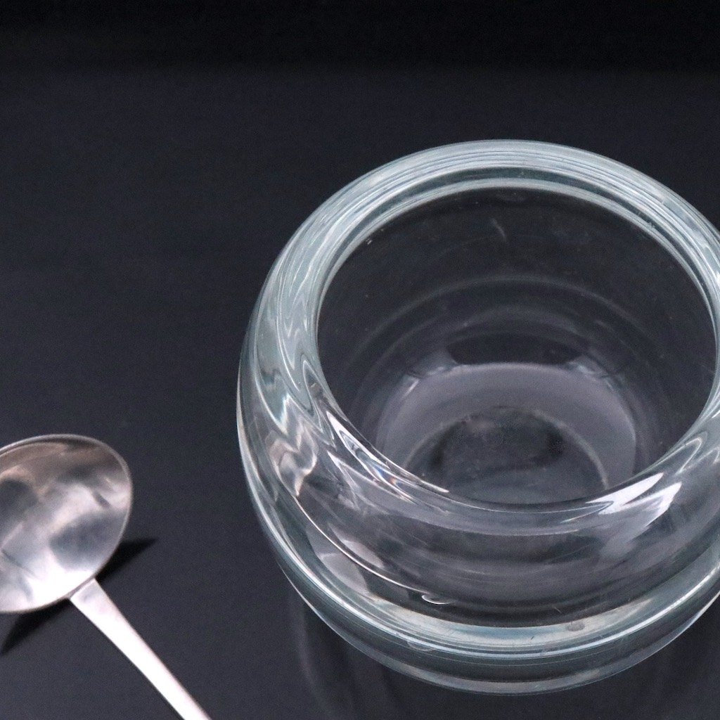 Svend Weihrauch / F. Hingelberg. Krukke i glas med låg og ske i sterlingsølv.