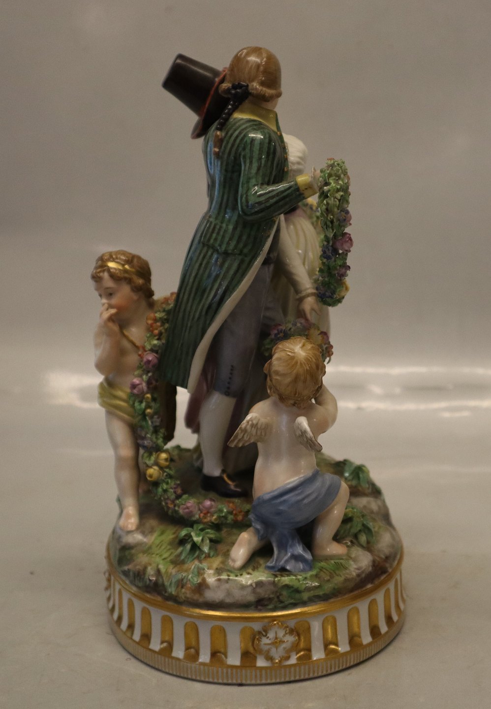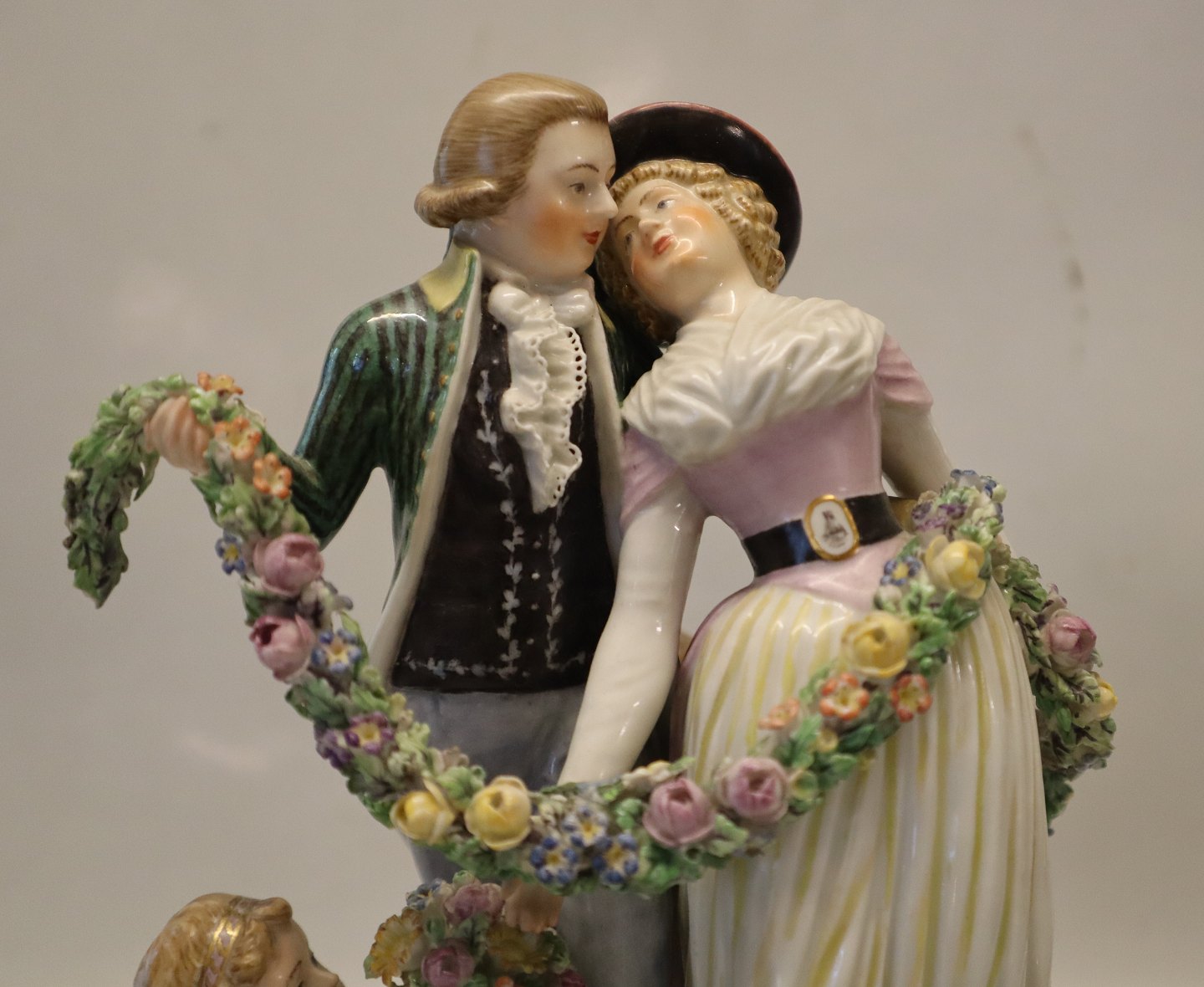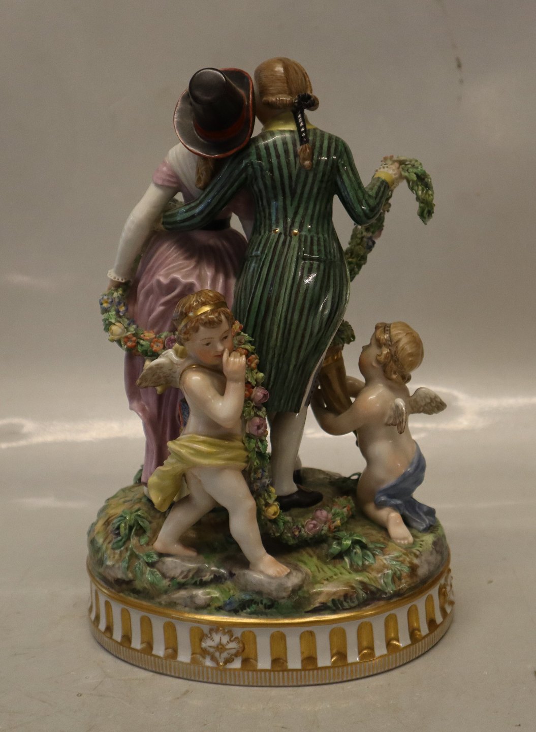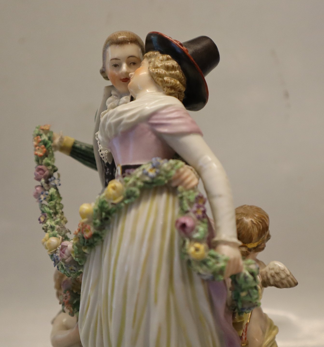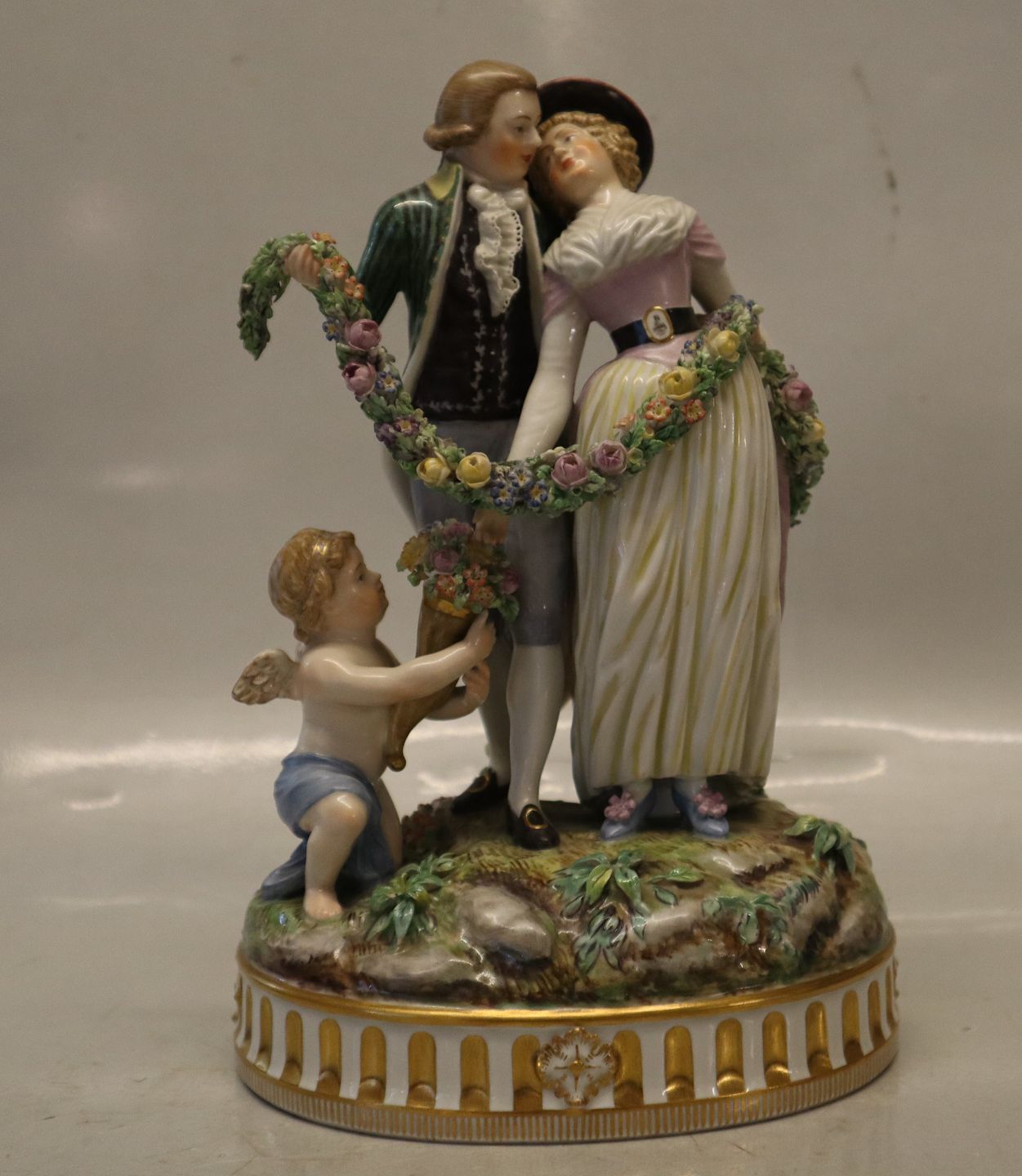 12154 Kgl. Kærlighedsgruppe: Victoriansk par med cupido´er 24 x 17 cm blomsterguirlander med pousserende blomster fra Royal Copenhagen I hel og fin stand Stemplet med Juliane Marie mærket