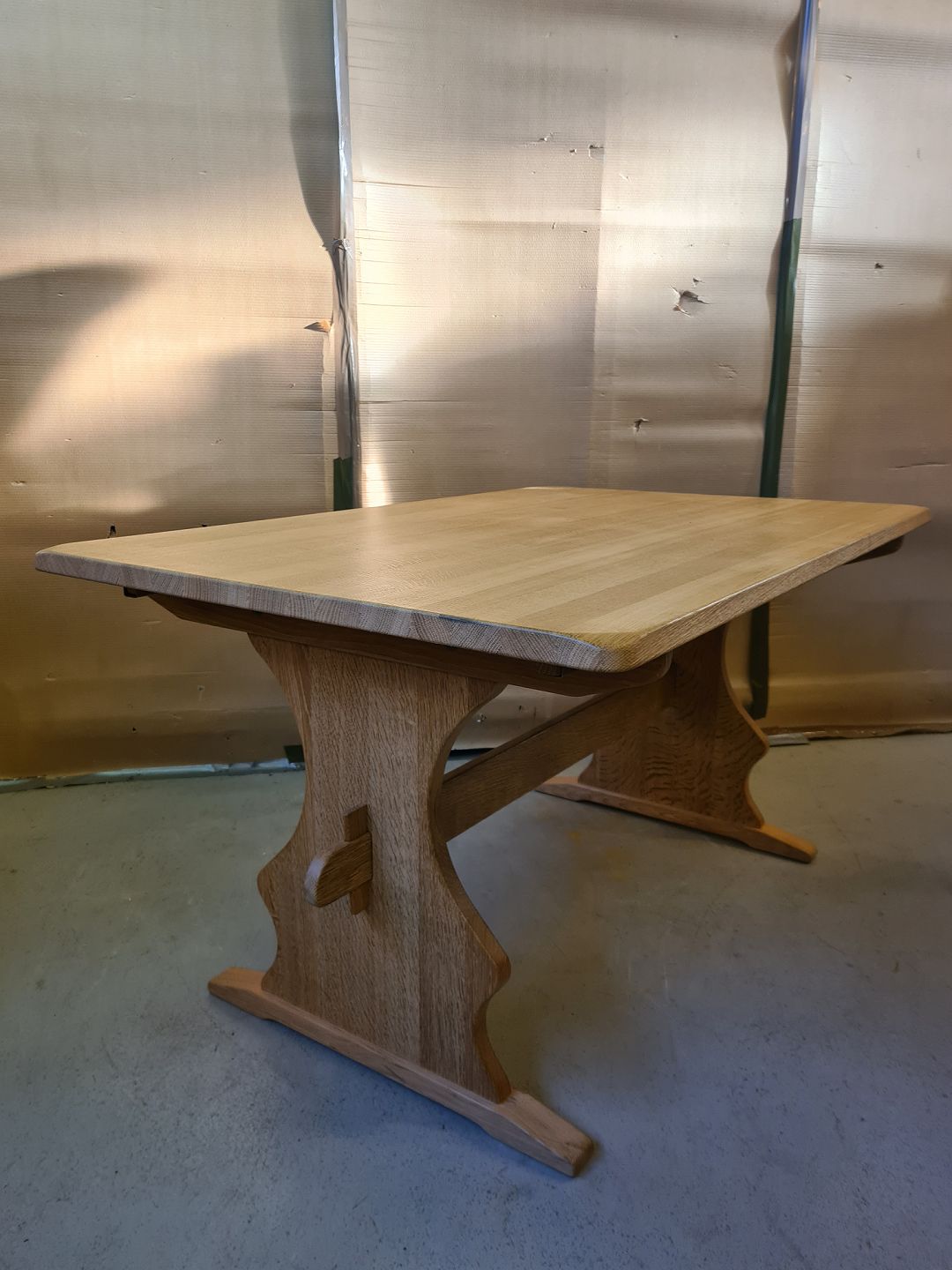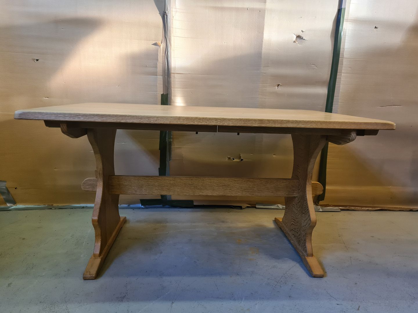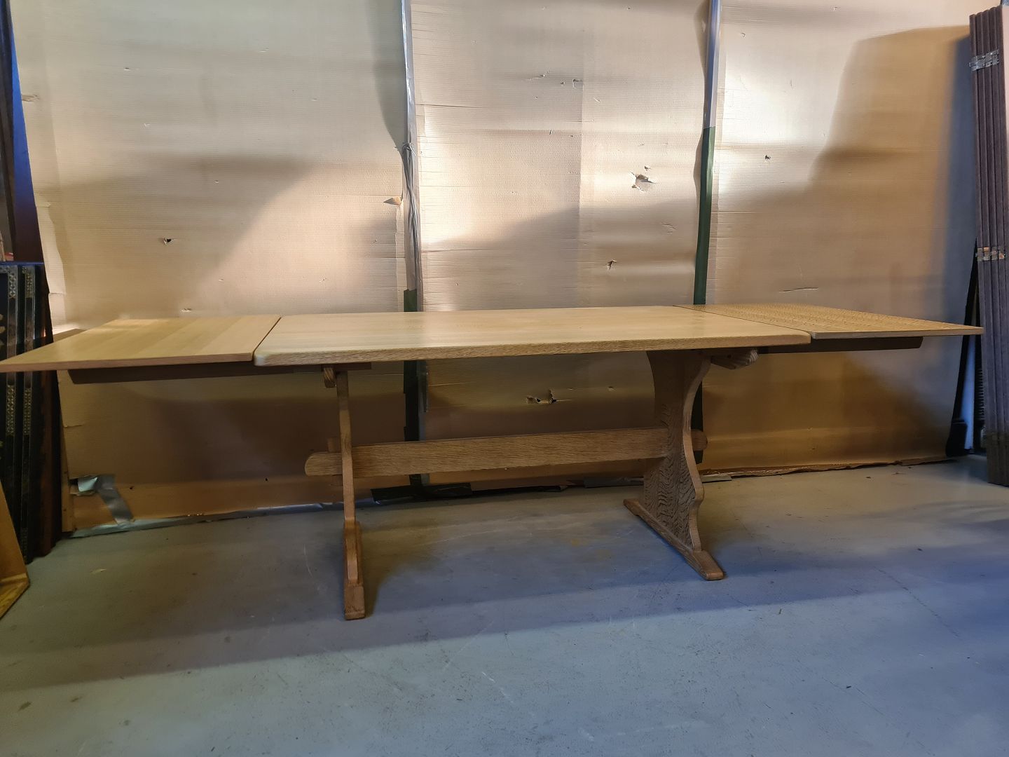 Spisebord i massivt egetræ med 2 tillægsplader, fra 1980erne.