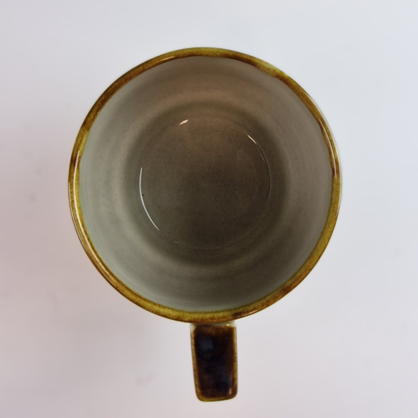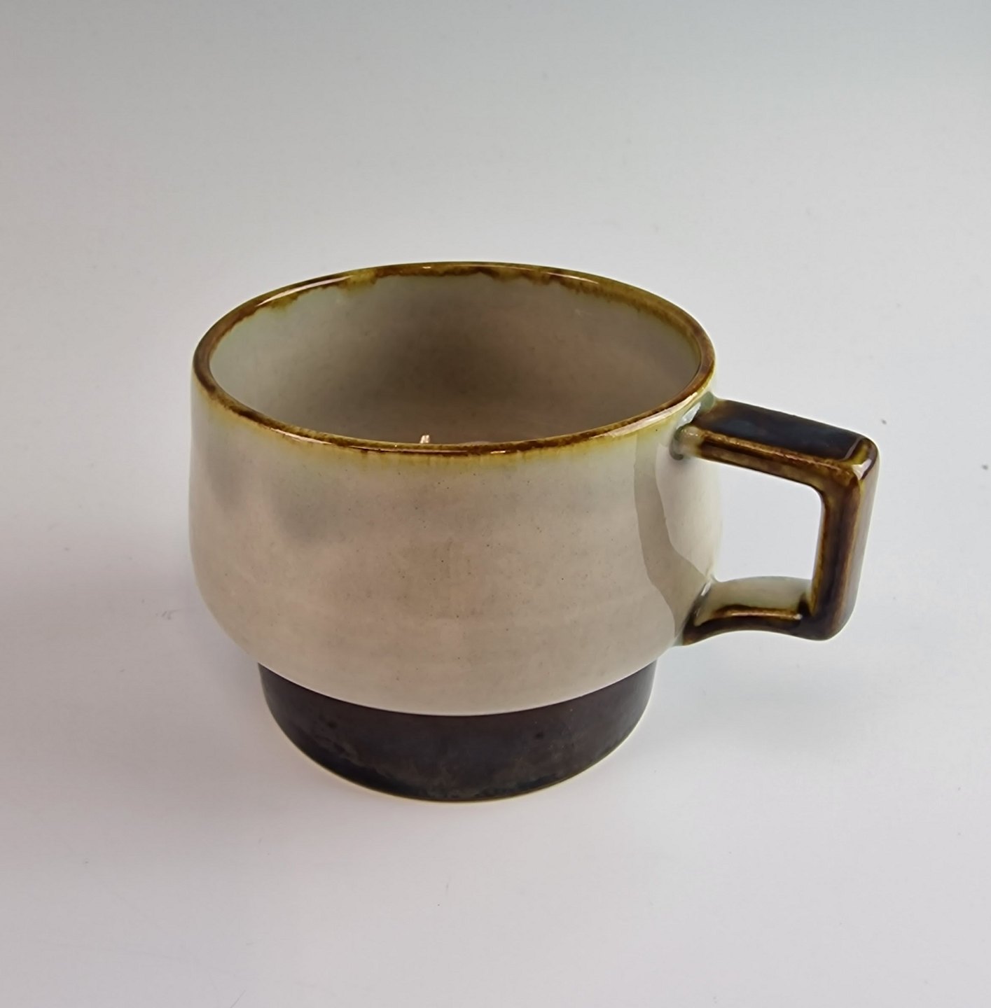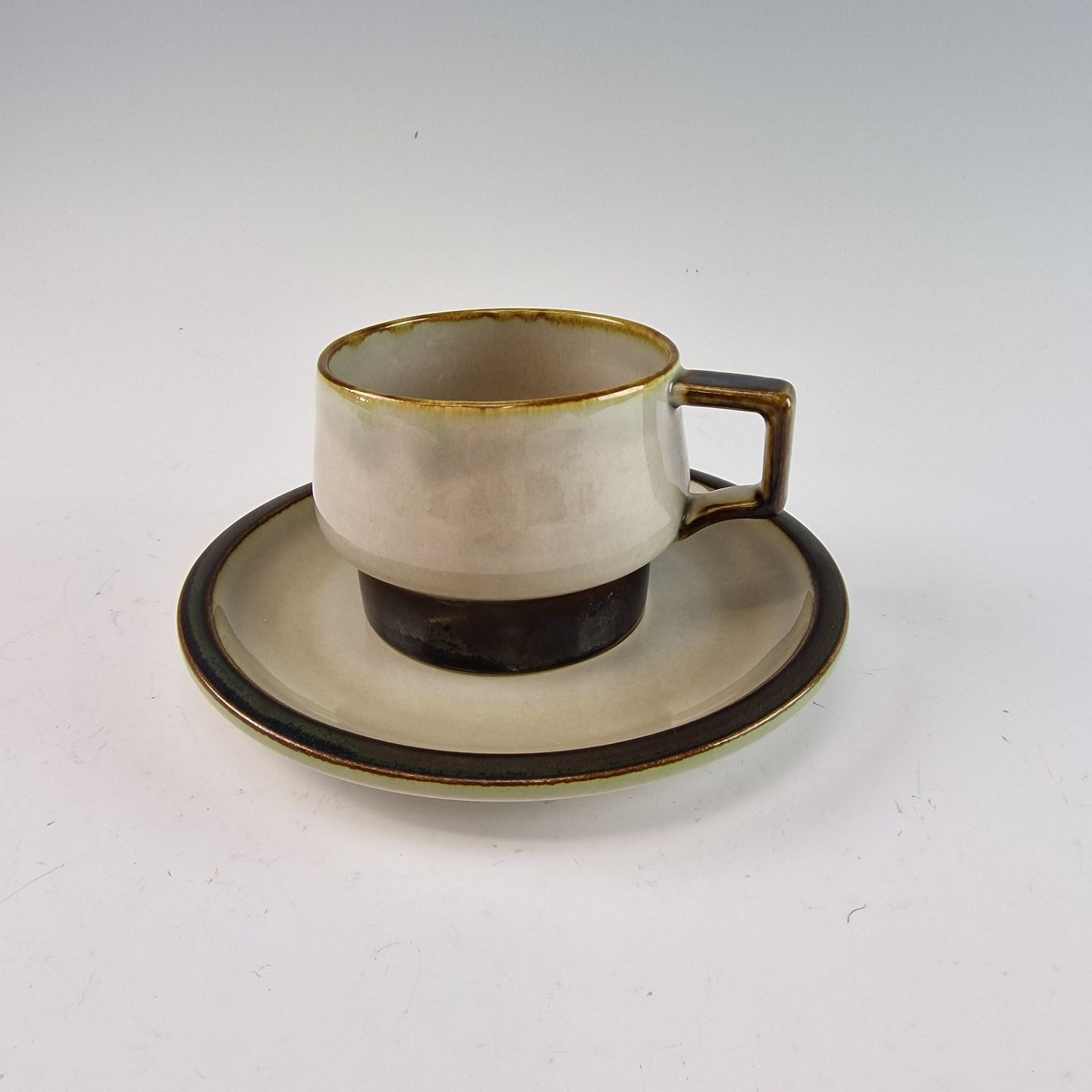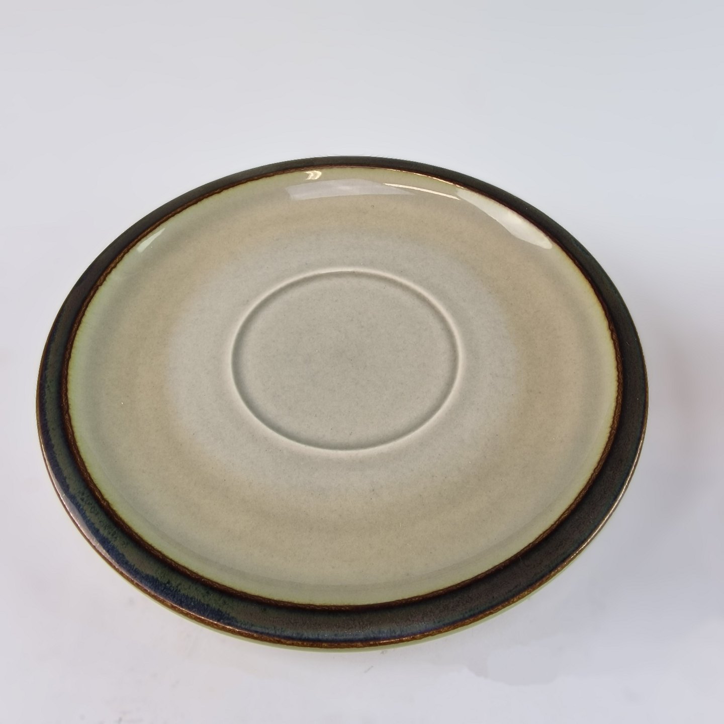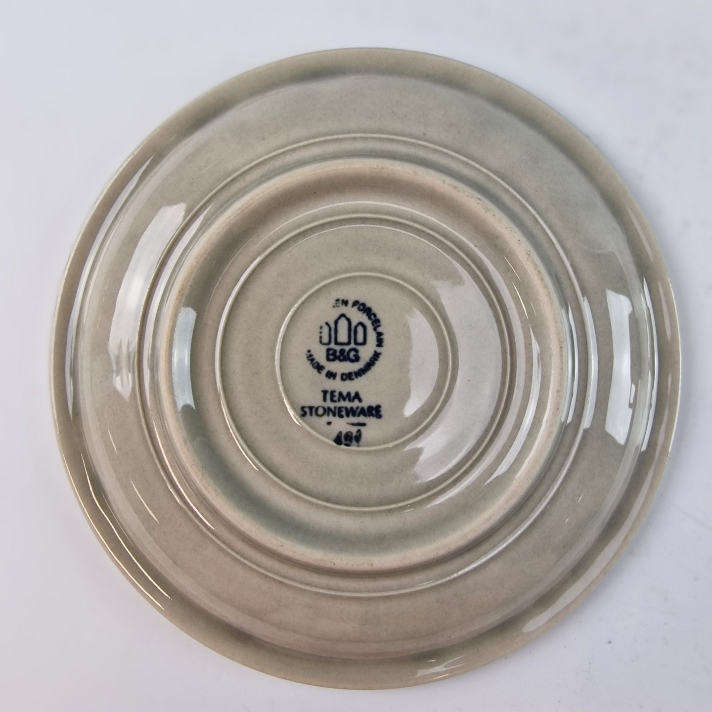 Stellet Tema er af stentøj, glaseret med lys grå og dekoreret med kanter af grønne og brune farver