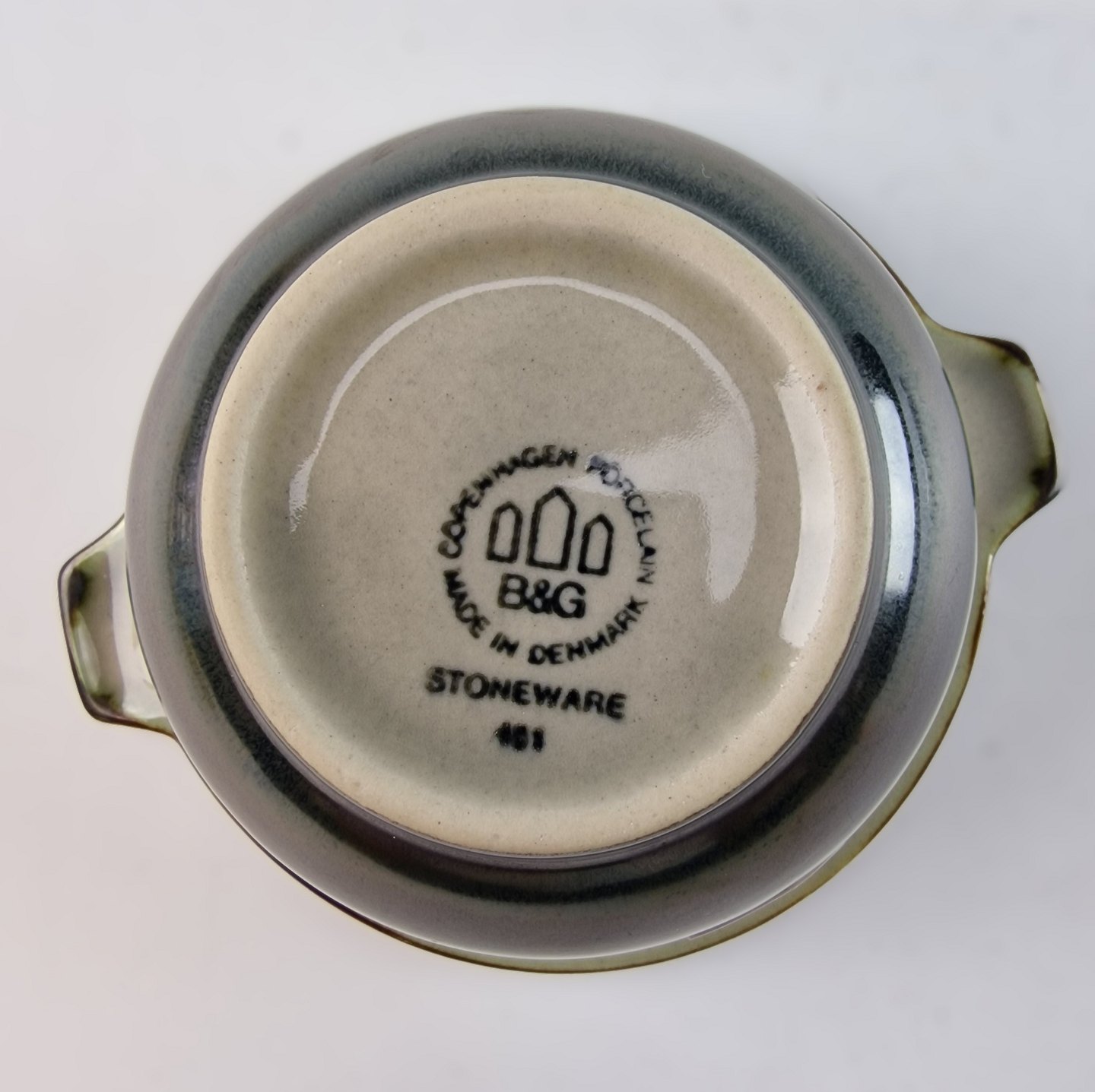 Stellet Tema er af stentøj, glaseret med lys grå og dekoreret med kanter af grønne og brune farver