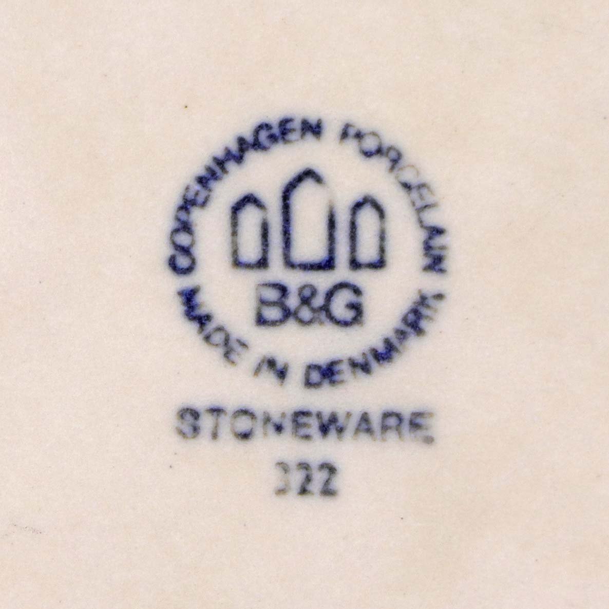 Stellet Peru er af stentøj, glaseret med lys grå farve og dekoreret med bånd af grøn/brunlige farve