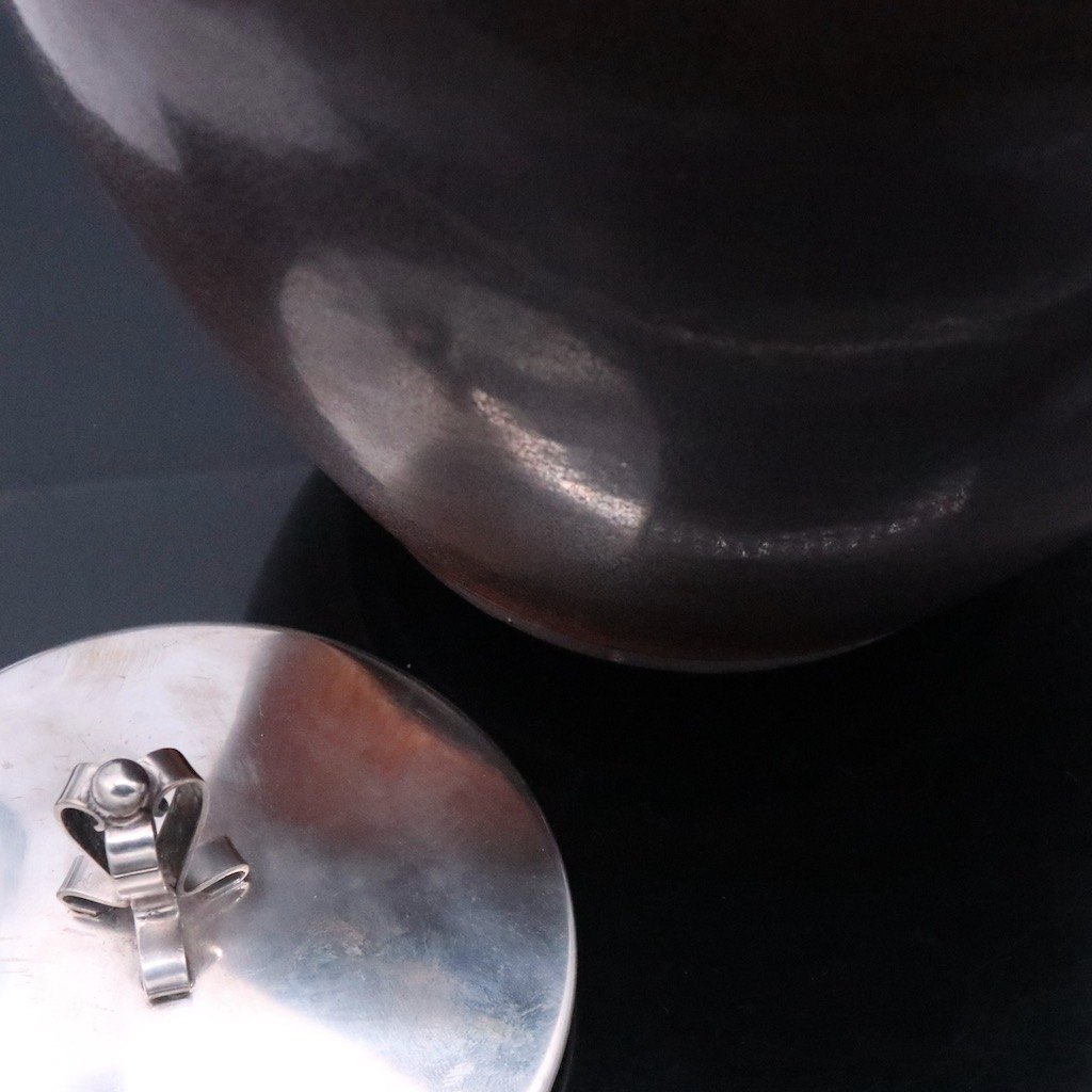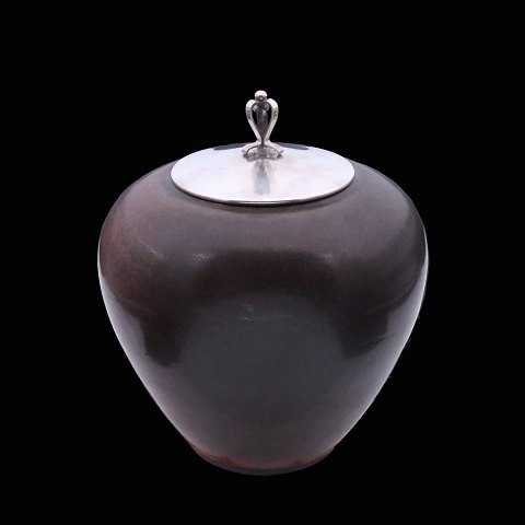 Saxbo - C. Jensen. Stor krukke i stentøj med låg i sølv.