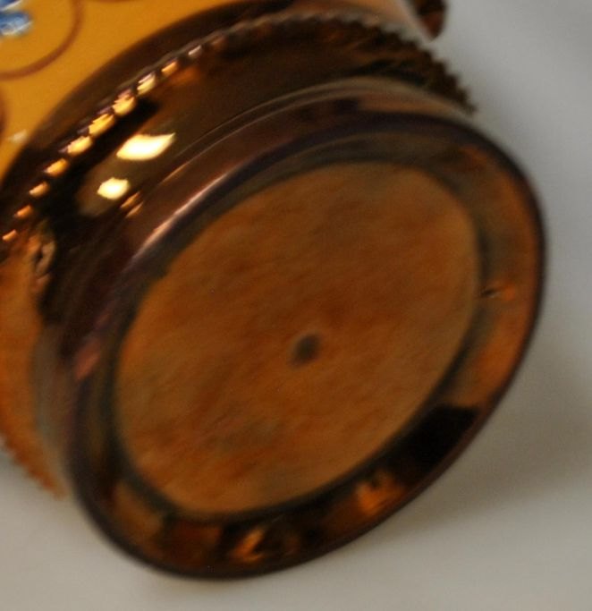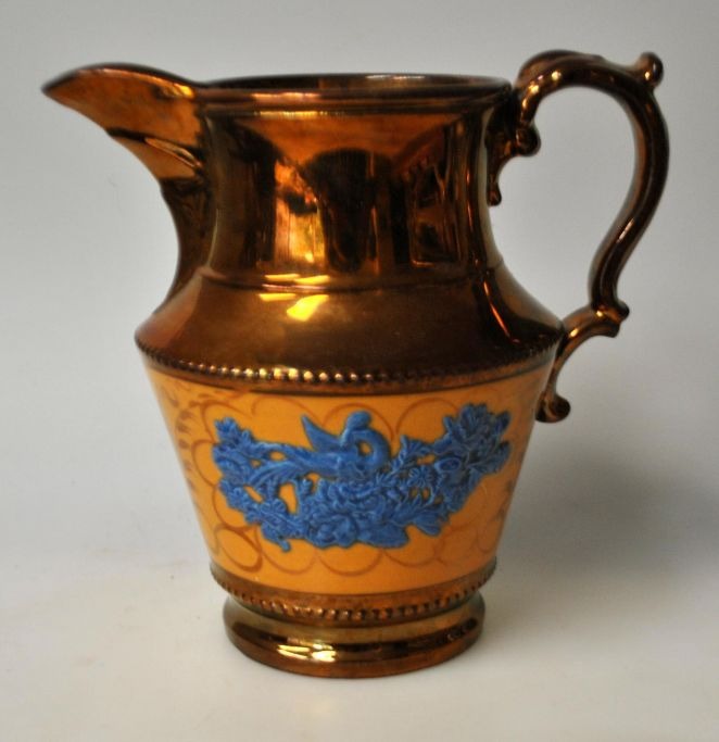 Engelsk lustra kande, 19. årh. Siden blådekoreret relief med påfugl og blomster. H.: 16,5 cm.