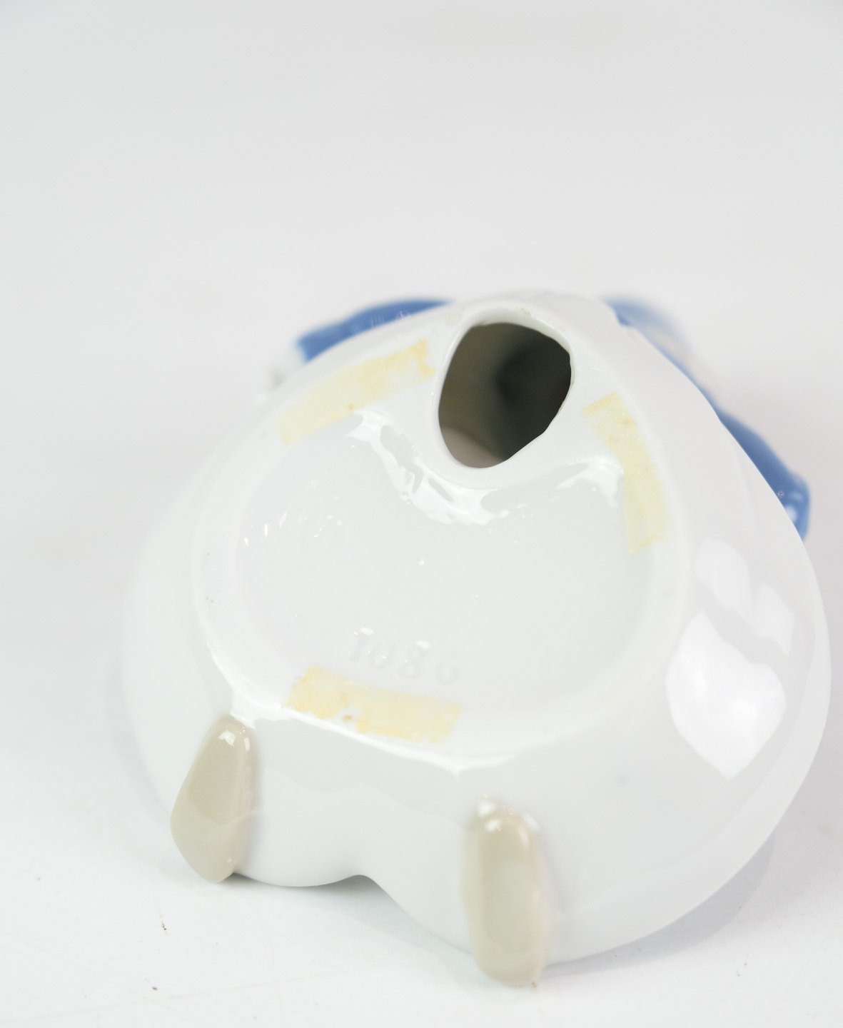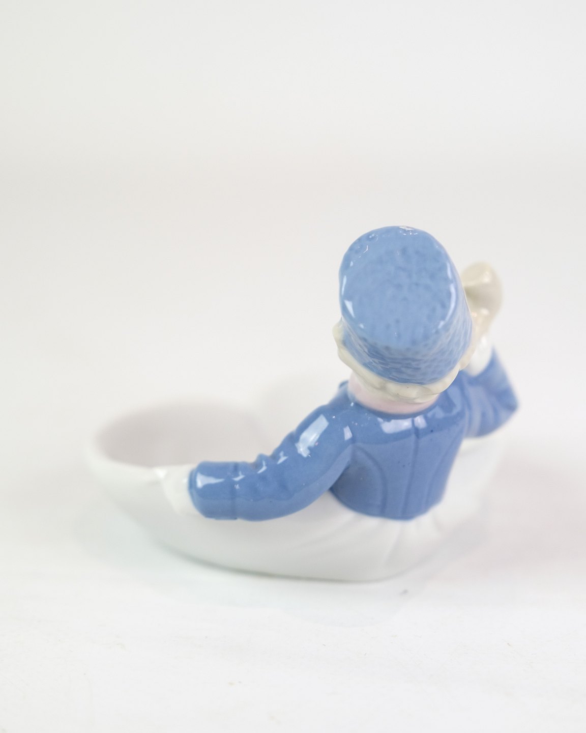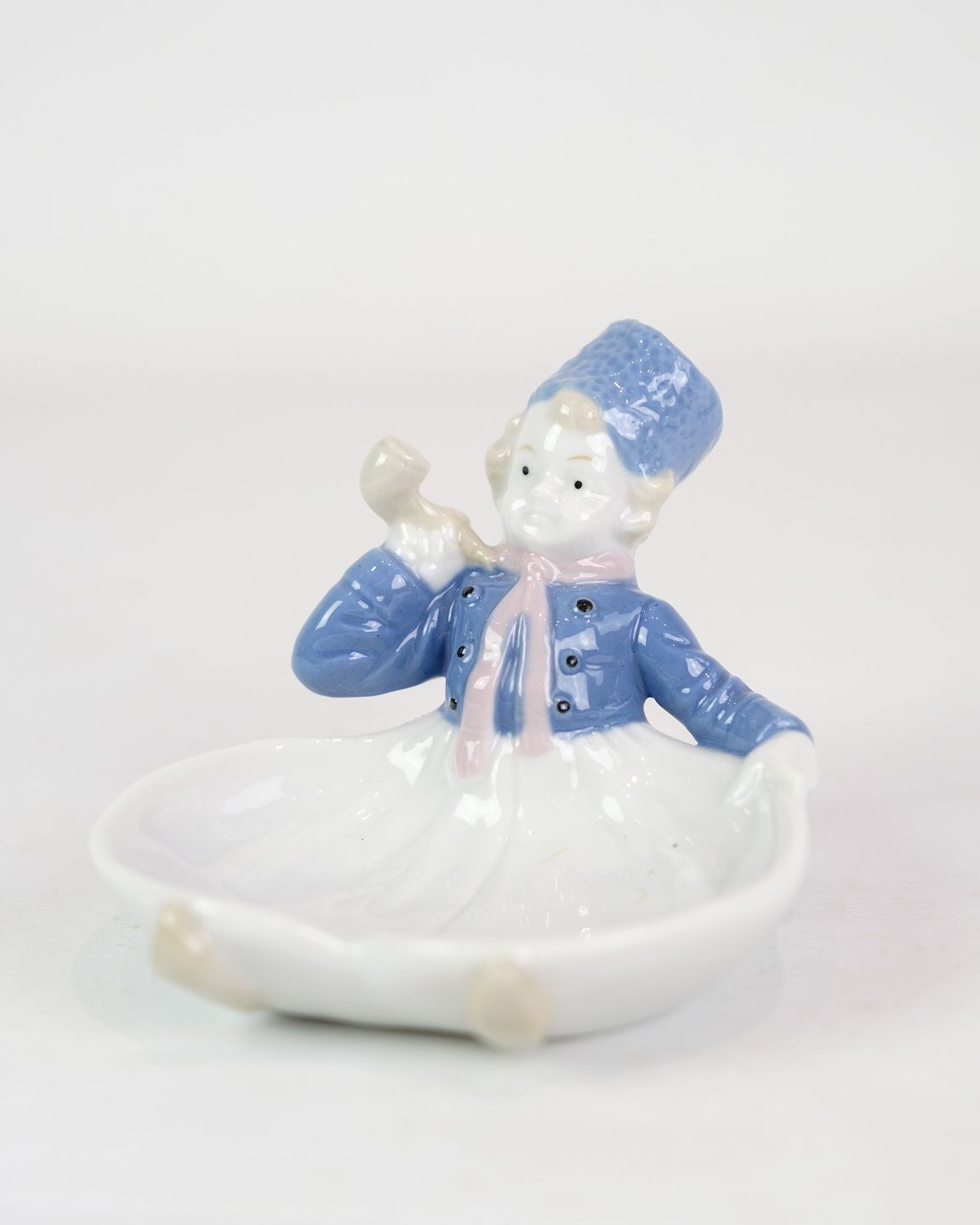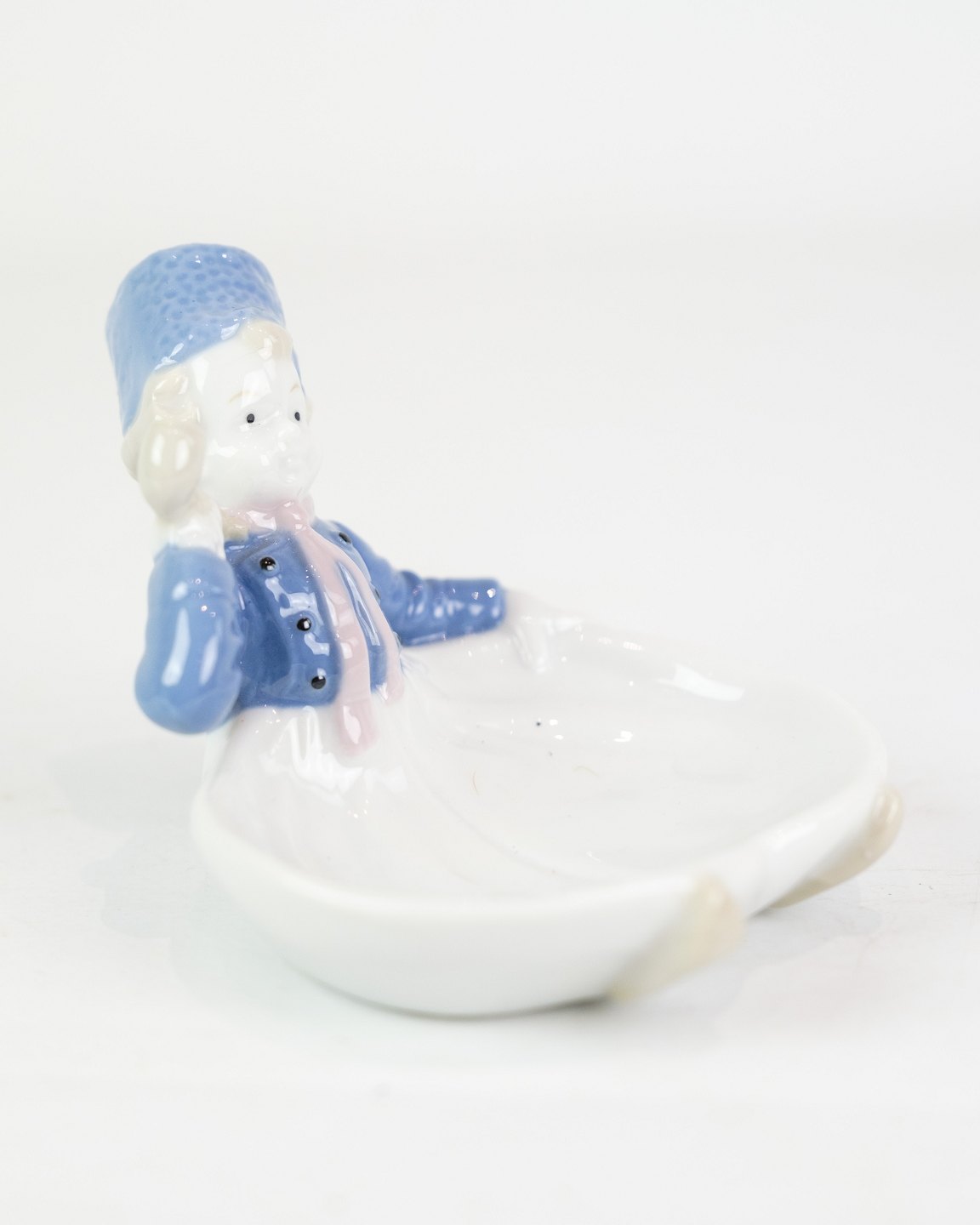 Figur af porcelæn med motiv af siddende dreng i uniform, som kan benyttes som lille skål nr. 1086