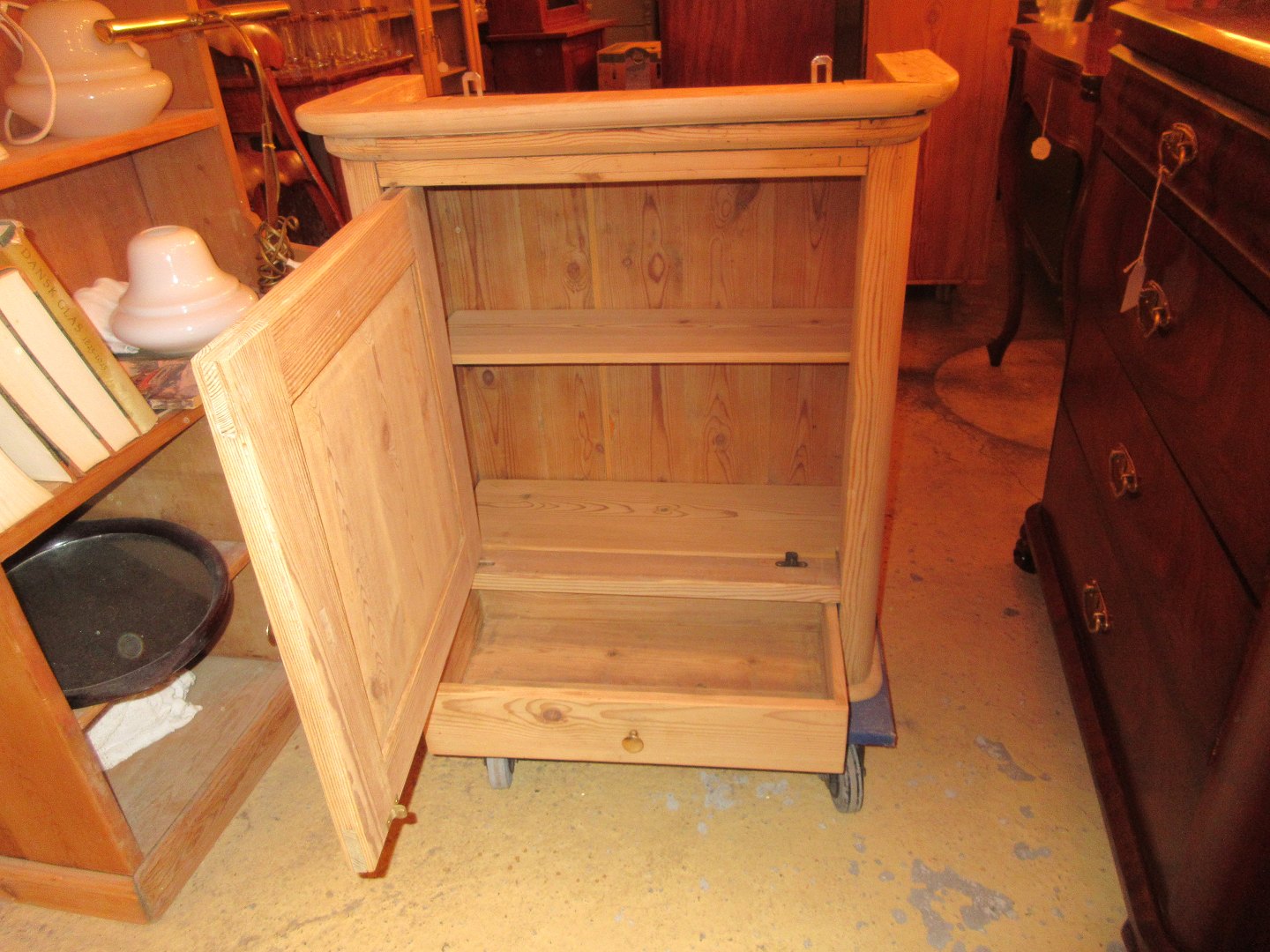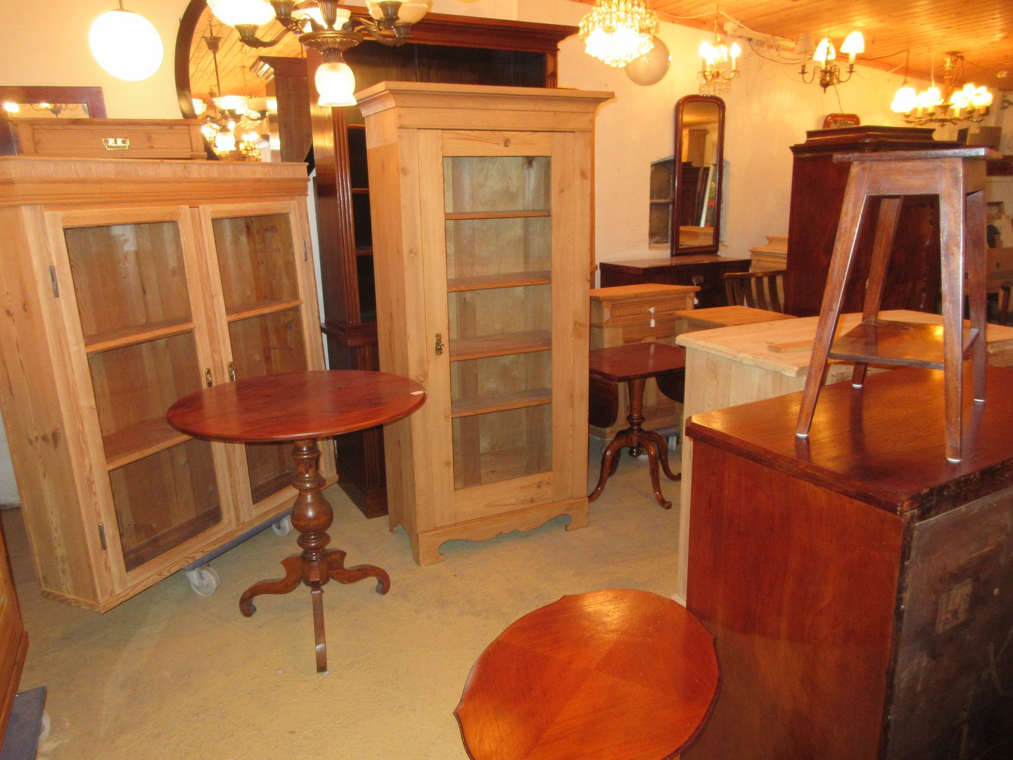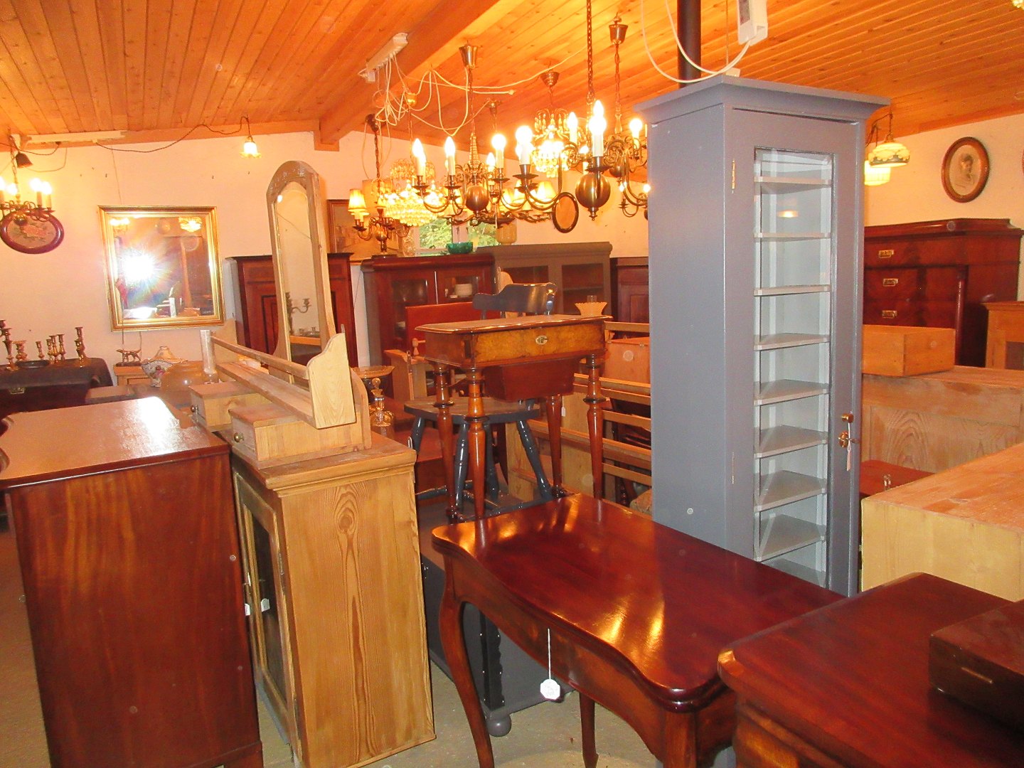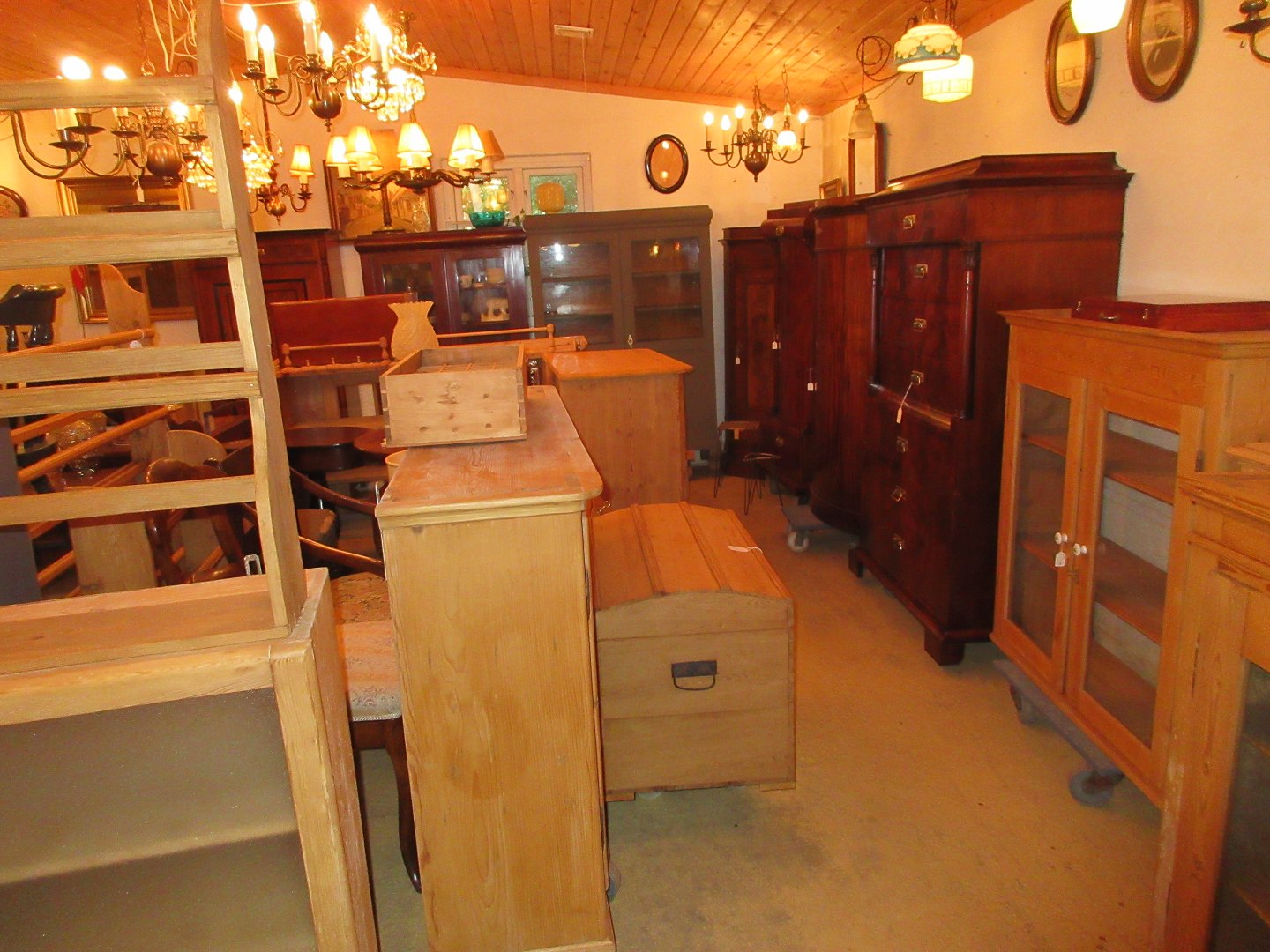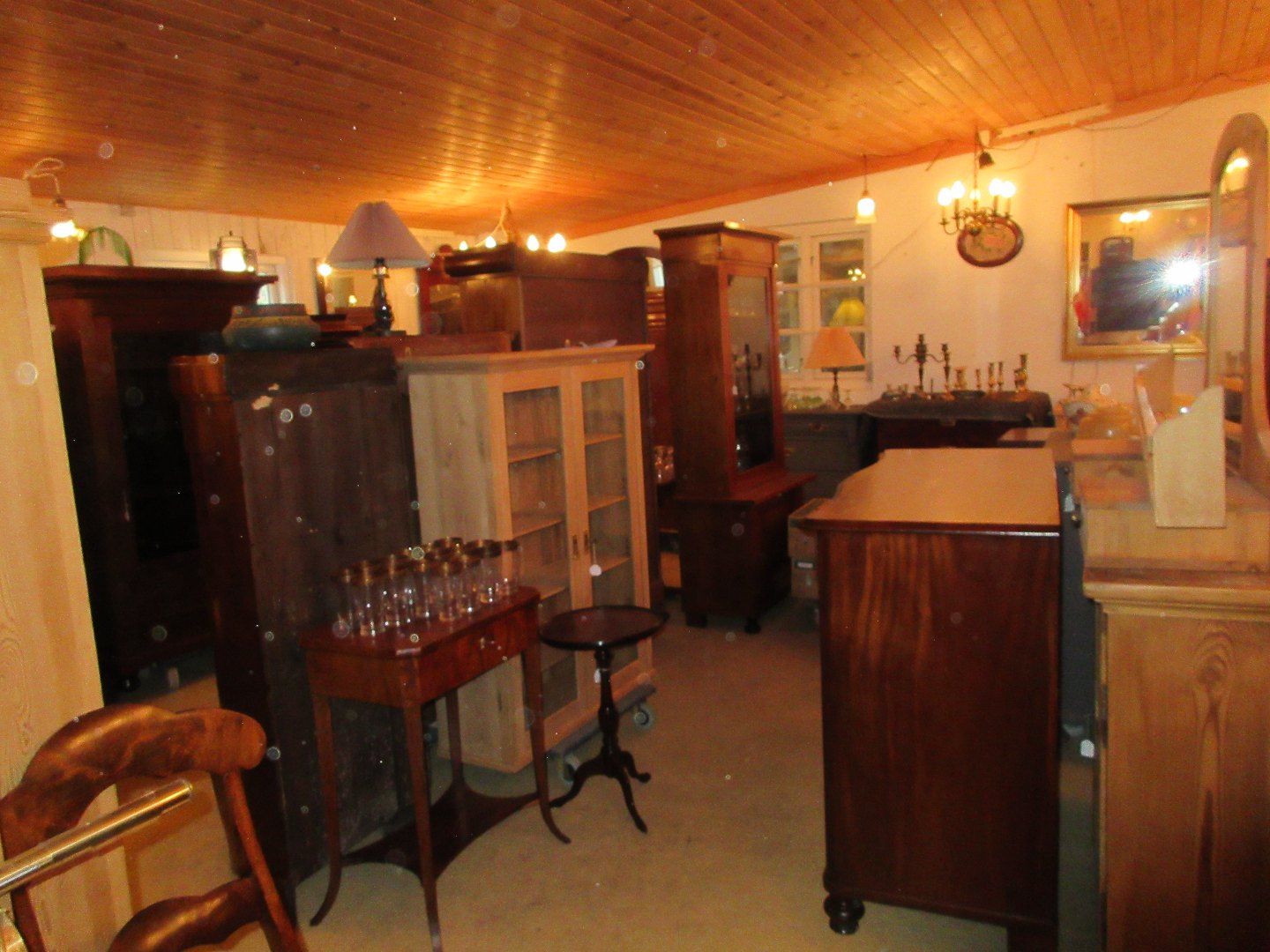 Stor salgsudstilling med restaurerede møbler håndpolerede mahognimøbler, afsyrede fyrretræsmøbler, malede træmøbler, kun originale gamle og antikke møbler.