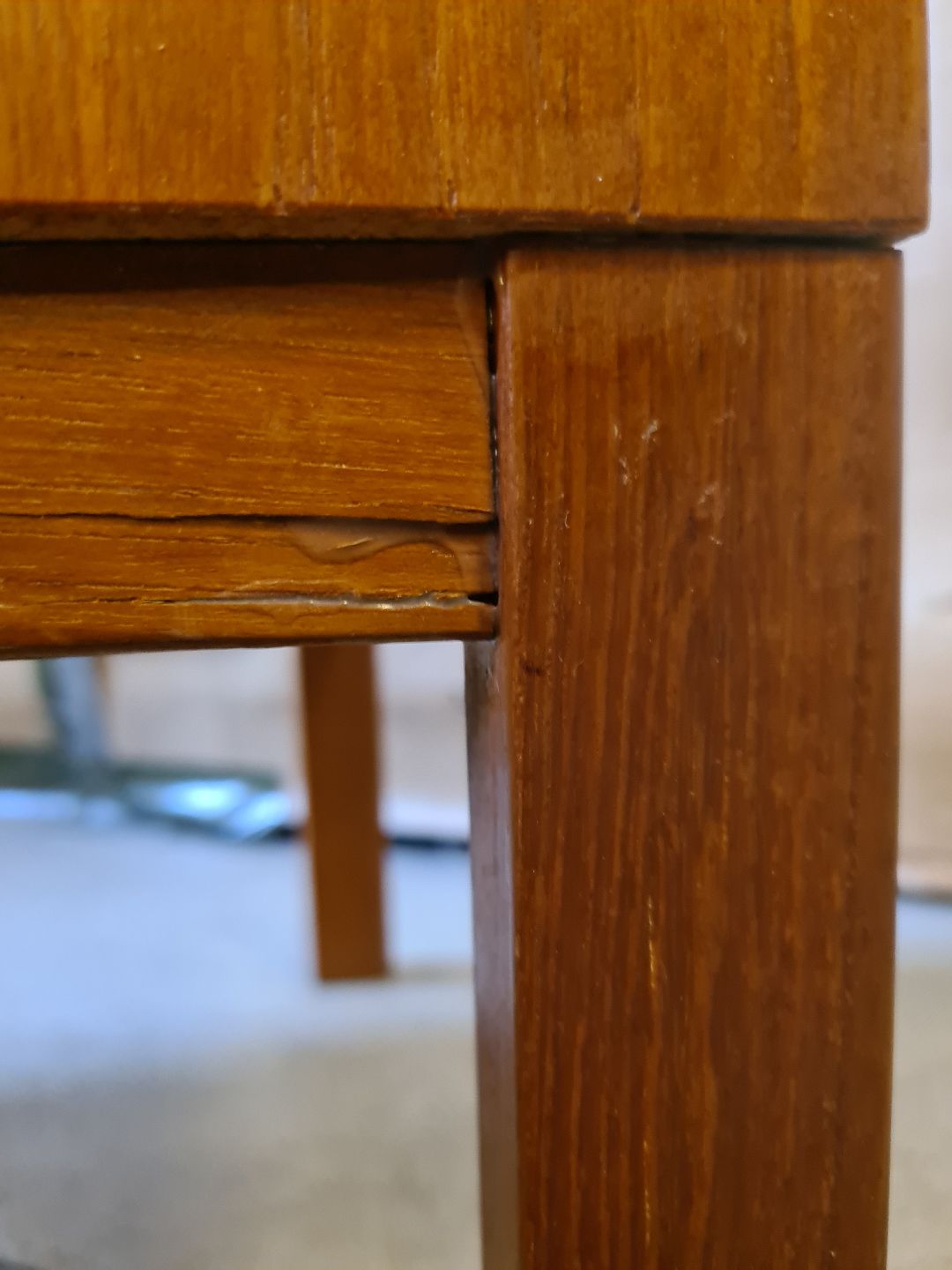 Den har brugsspor og en reparation på bagbenet.