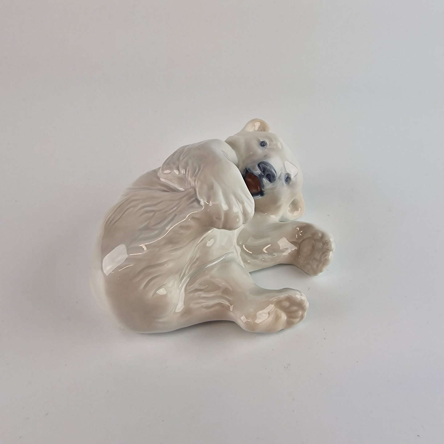 Figur som forestiller en isbjørn der ligger på siden og leger med sine poter, arkivfoto