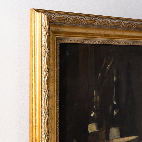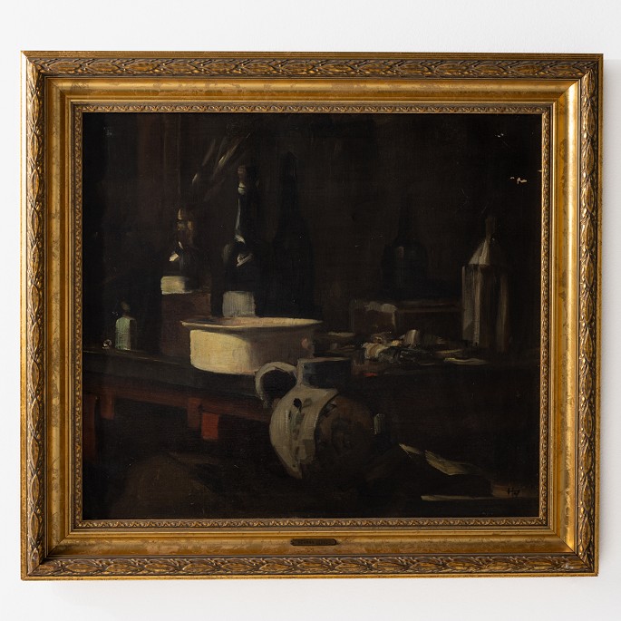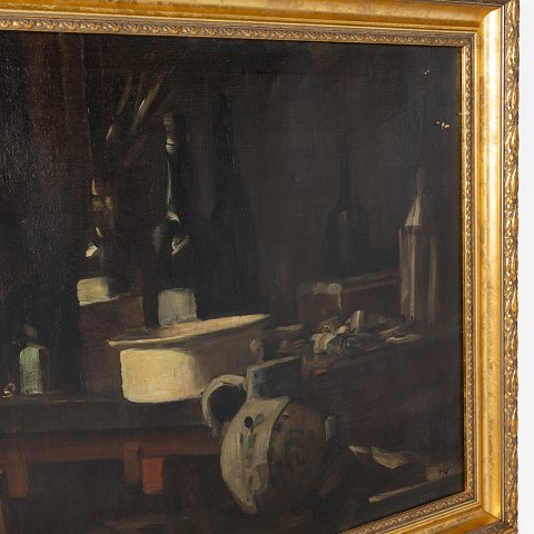 Maleri. Opstilling med kande, med guldbemalet ramme. Signeret.