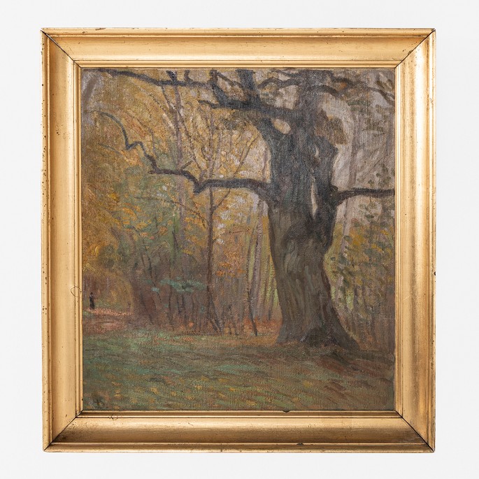 Olie på lærred. Parti med efterårsskov med guldbemalet ramme. signeret.