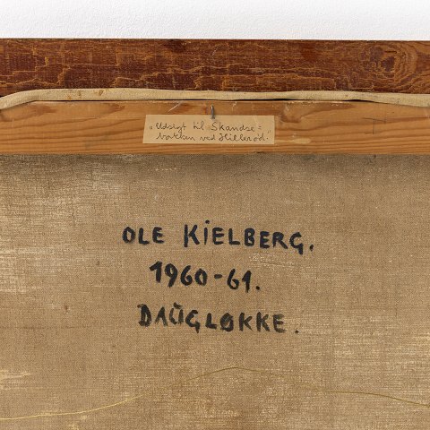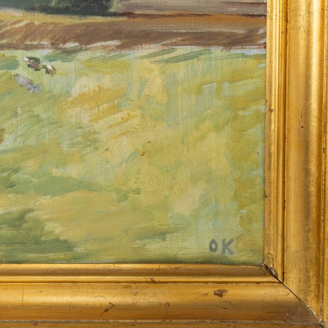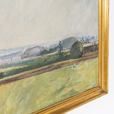 Maleri. 'Udsigt til Skansebakken ved Hillerød' med guldbemalet ramme fra 1960-61. Dauløkke. Signeret.